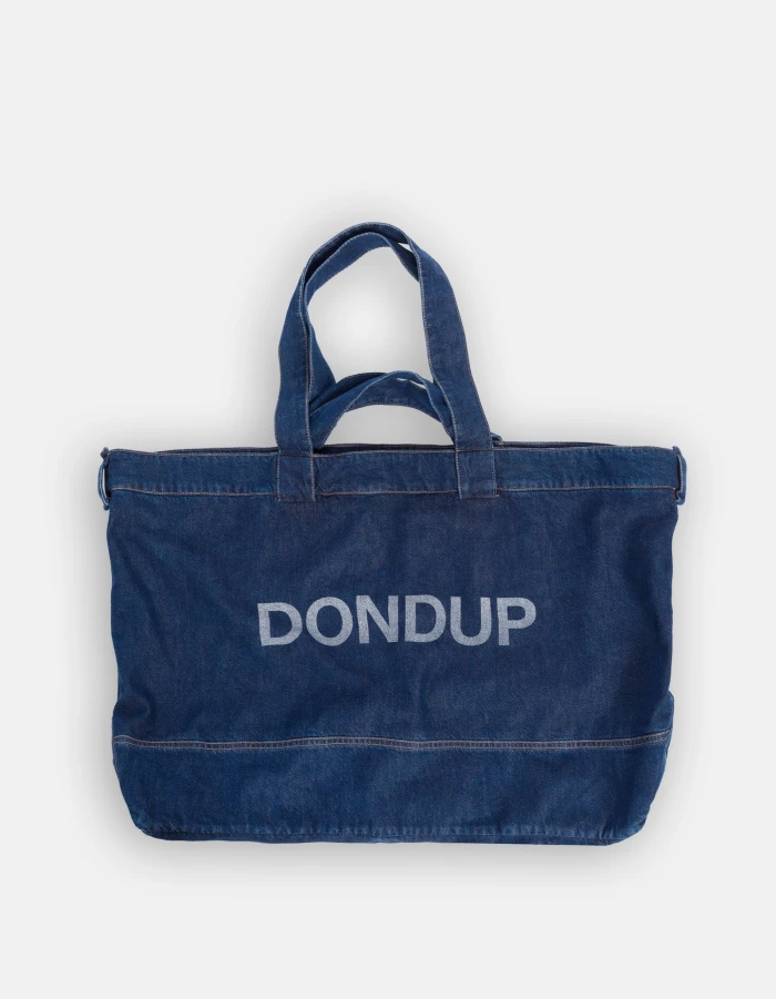 Shopping bag with double handles, logo print on the front and internal pocket with flap closure. Dimensions: h. 43cm x w. 66cm x d. 14cm. Medium clean wash. Dondup logo. Made in Italy