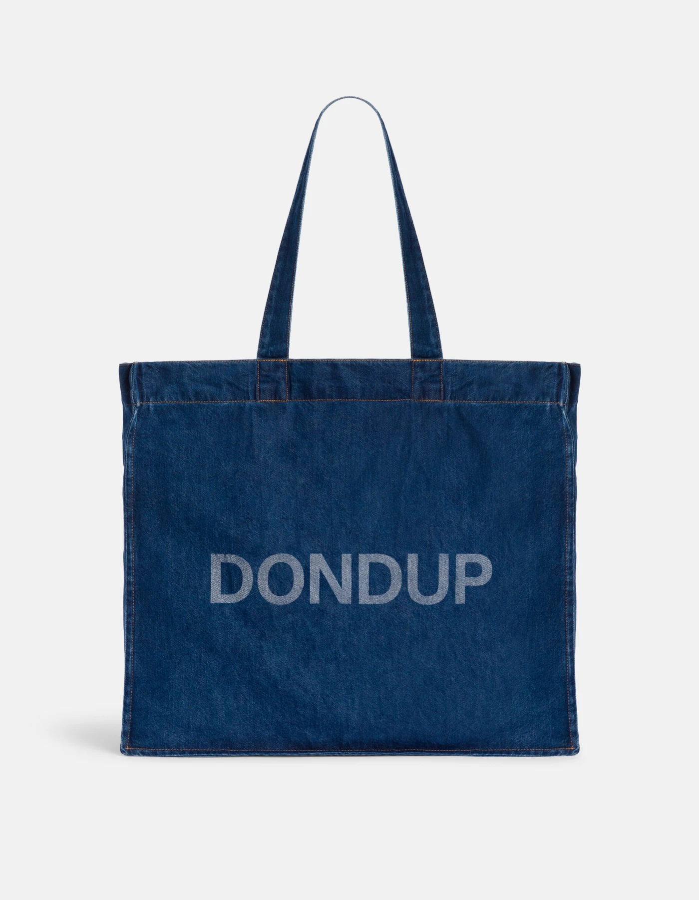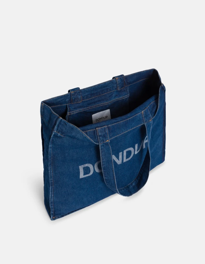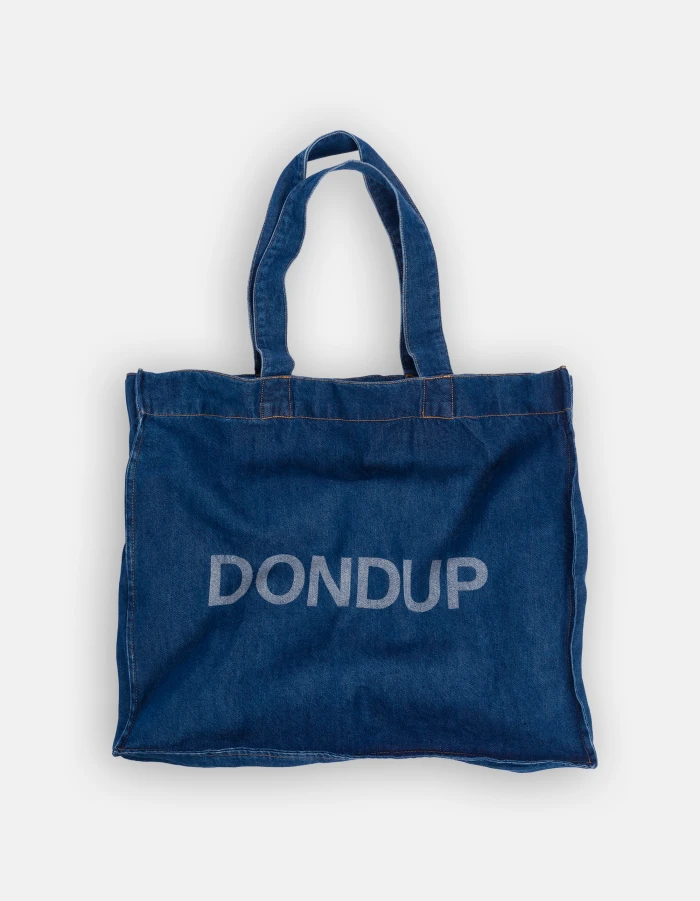 Shopping bag with double handles, logo print on the front and internal pocket with flap closure. Dimensions: h. 43cm x w. 50cm x d. 10cm. Medium clean wash. Dondup logo. Made in Italy