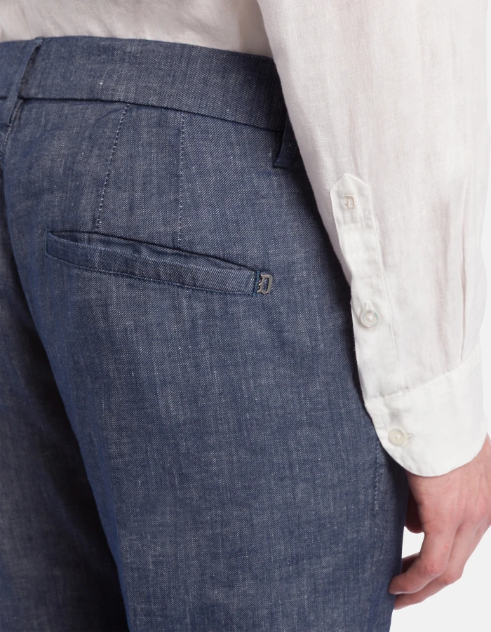 Pablo regular-fit chinos, regular waist, welt pockets at the back, length 29 inches. Stretch linen and cotton gabardine. Dondup logo. Made in Italy
