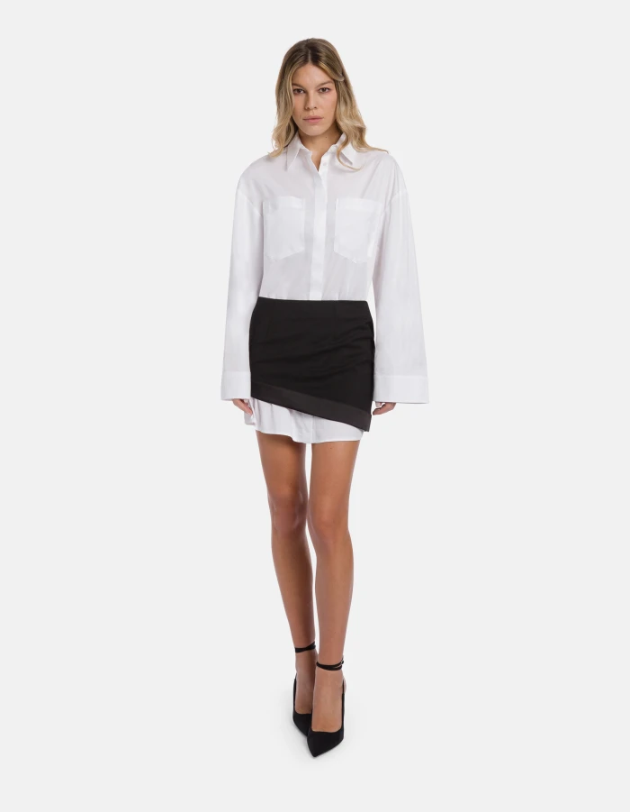 Short dress consisting of a long-sleeved blouse and detached skirt with a matching tuxedo band. Yarn-dyed gabardine. Dondup logo. Made in Italy