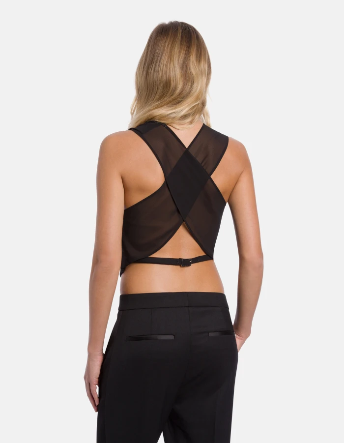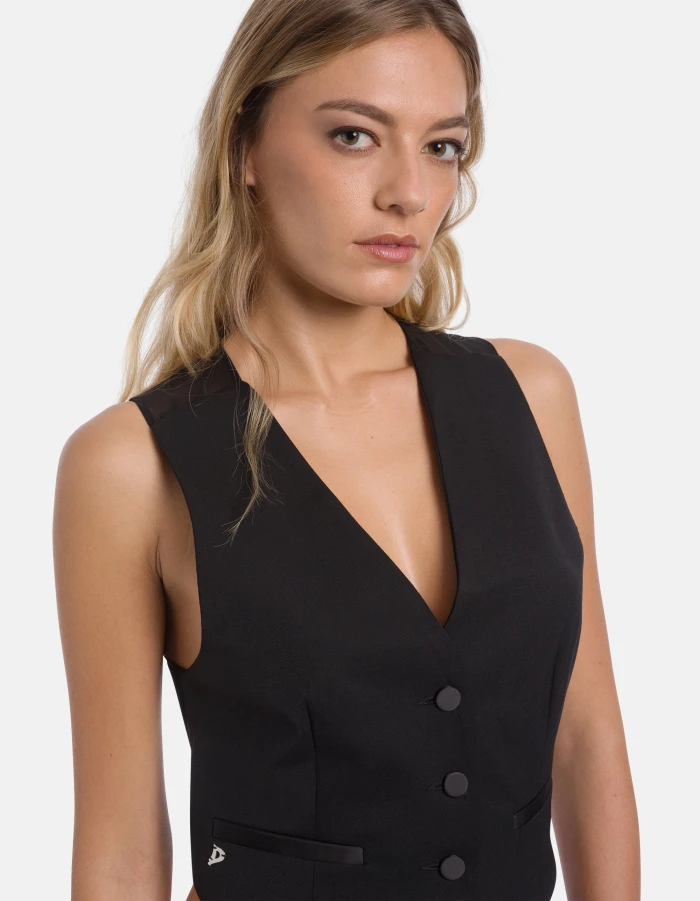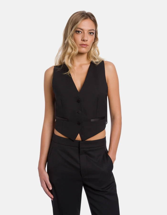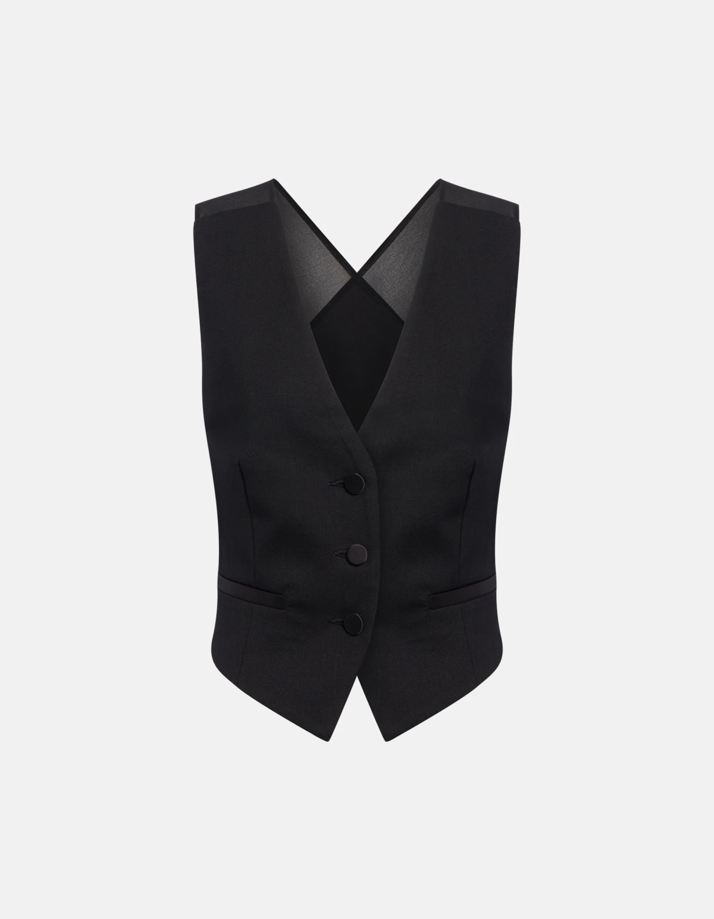 Slim-fit V-neck waistcoat with three covered buttons, welt pockets and crossover voile back. Wool-blend gabardine. Dondup logo. Made in Italy