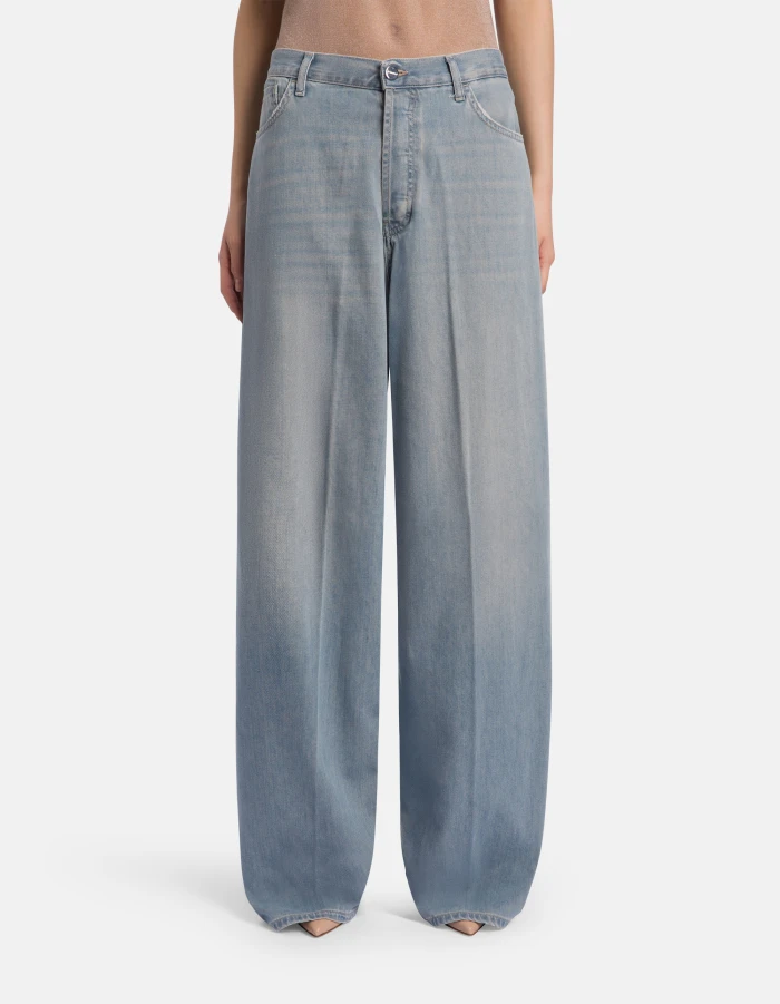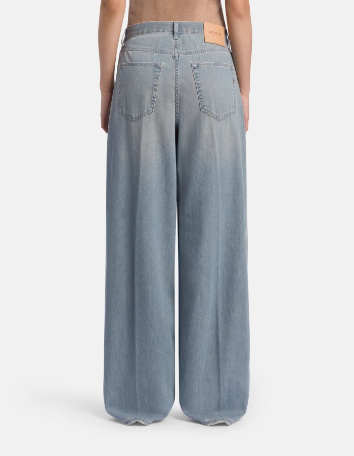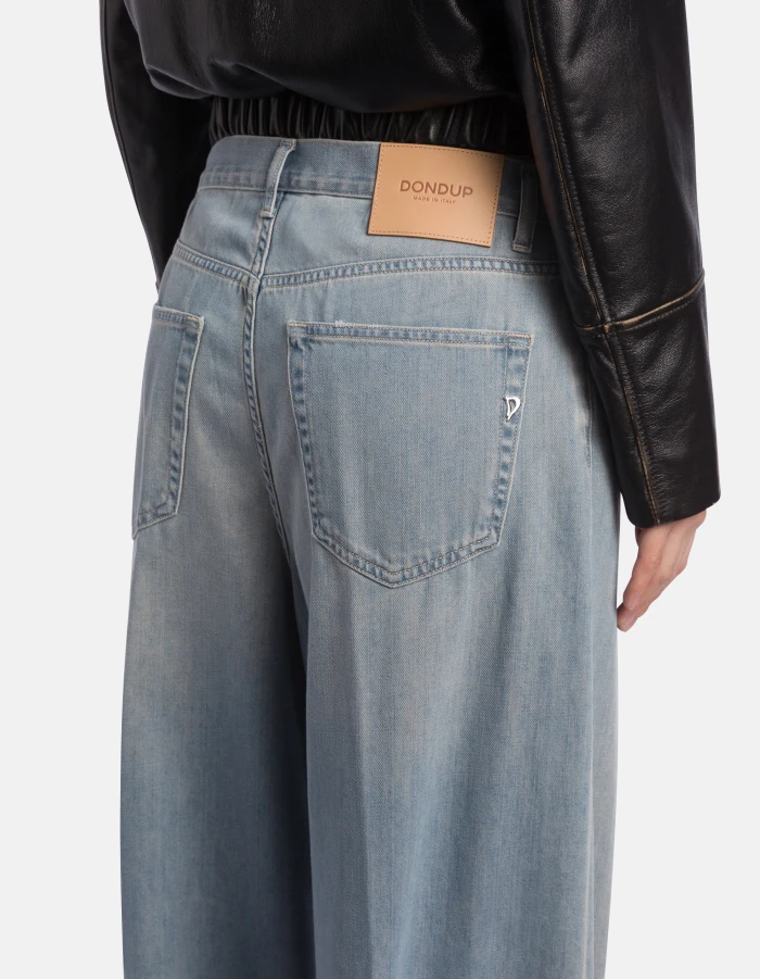 Five-Pocket-Jeans Dakota in lockerer Passform mit niedrigem Bund und weitem Bein im Palazzo-Stil. Blauer Rigid Denim, 10 oz. Vintage-GRS-Waschung in Dirty-Optik. Dondup-Logo. Made in Italy