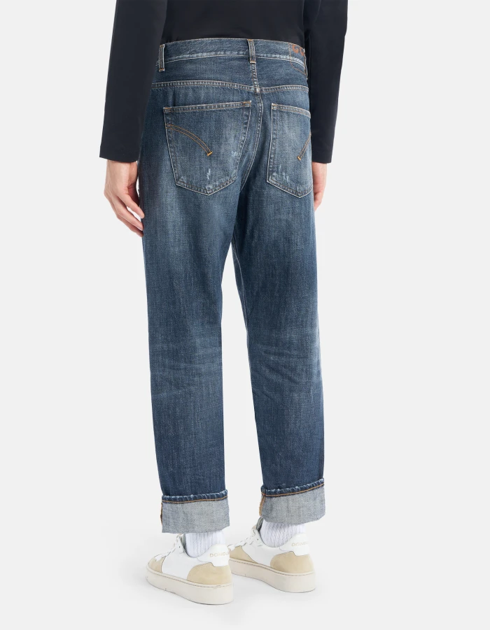 Five-Pocket-Jeans Paco in lockerer Passform mit normalem Bund. Blau-grauer recycelter Rigid Denim, 12 3/4 oz. Dunkle Vintage-Waschung mit Rissen und Ausbesserungen. Dondup-Logo. Made in Italy