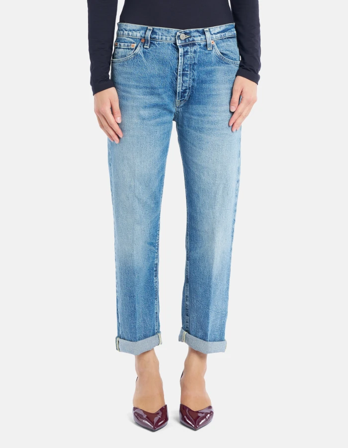 Five-Pocket-Jeans Icon in normaler Passform mit normalem Bund. Blauer recycelter Stretch-Comfort-Denim, 12 1/2 oz. Schlichte helle Vintage-Waschung. Dondup-Logo. Made in Italy
