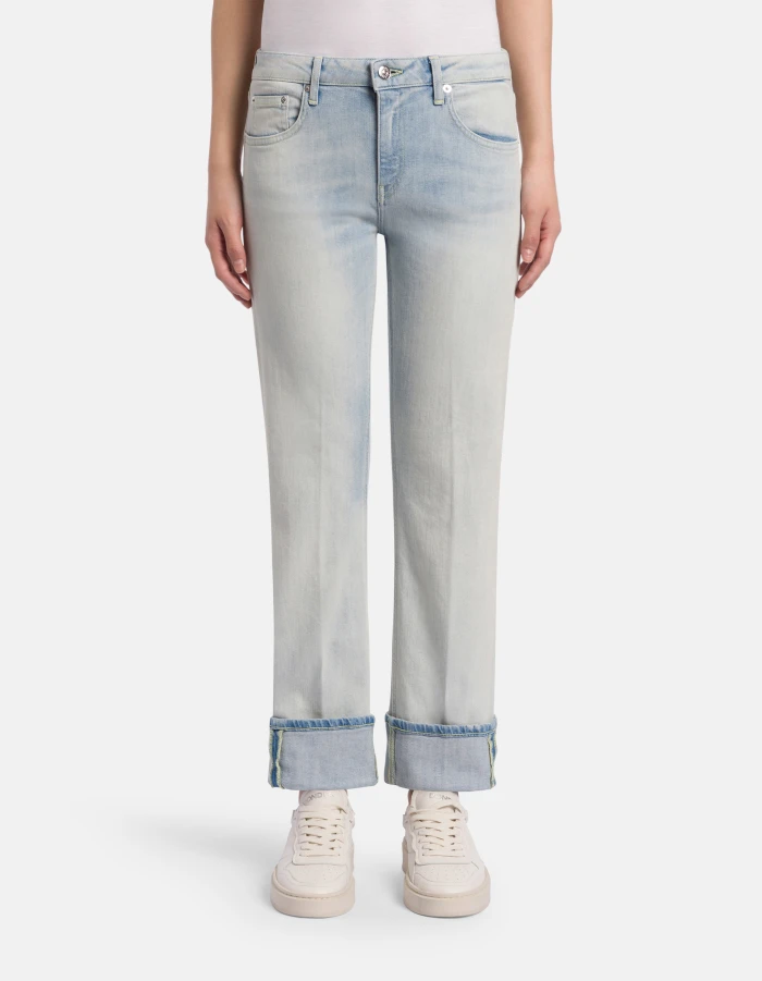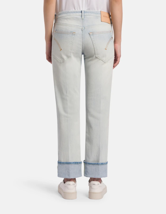 Five-Pocket-Jeans Coco in schmaler Passform mit normalem Bund und hohem, nicht genähtem Umschlag am Saum. Blauer Stretch-Denim, 12 oz. Schlichte helle Vintage-Waschung. Dondup-Logo. Made in Italy