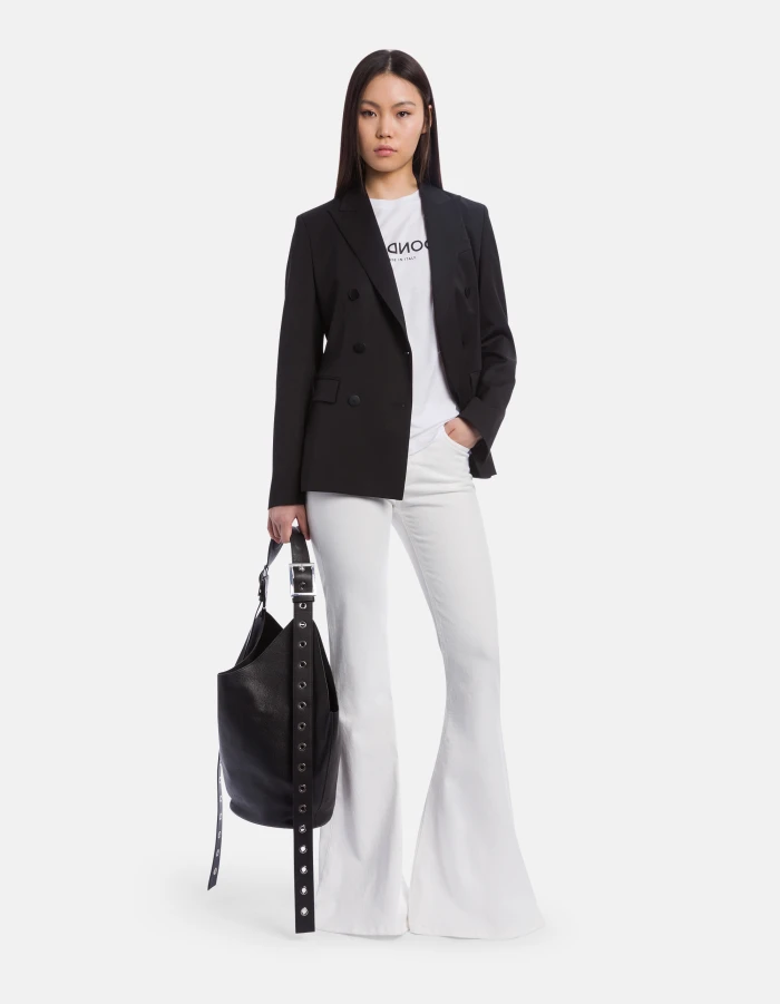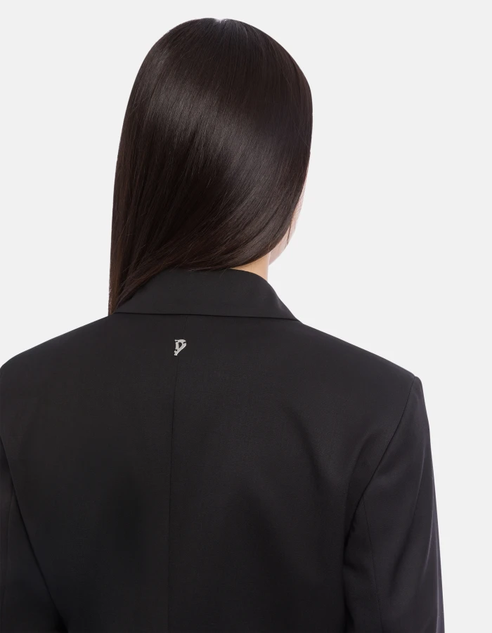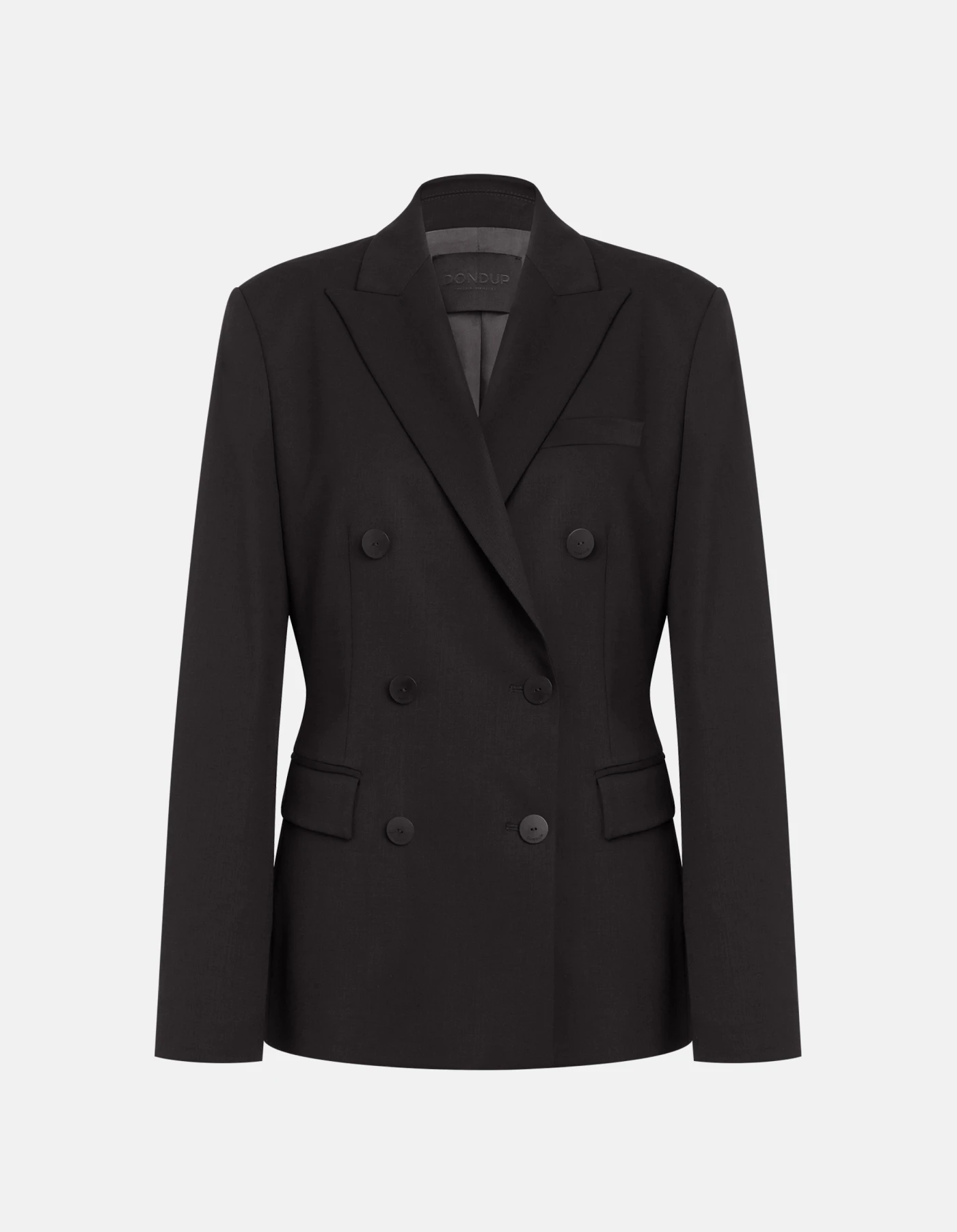 Zweireihiger 6-Knopf-Blazer in schmaler Passform mit Spitzfasson und Pattentaschen. Stretchgabardine mit Cool Wool. Dondup-Logo. Made in Italy