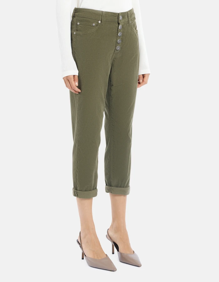 Koons loose-fit five-pocket trousers, regular waist, jewel button panel, ankle length. Stretch cotton and lyocell velvet. Garment dyed. Dondup logo. Made in Italy