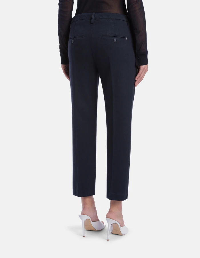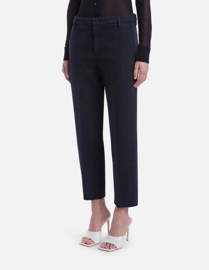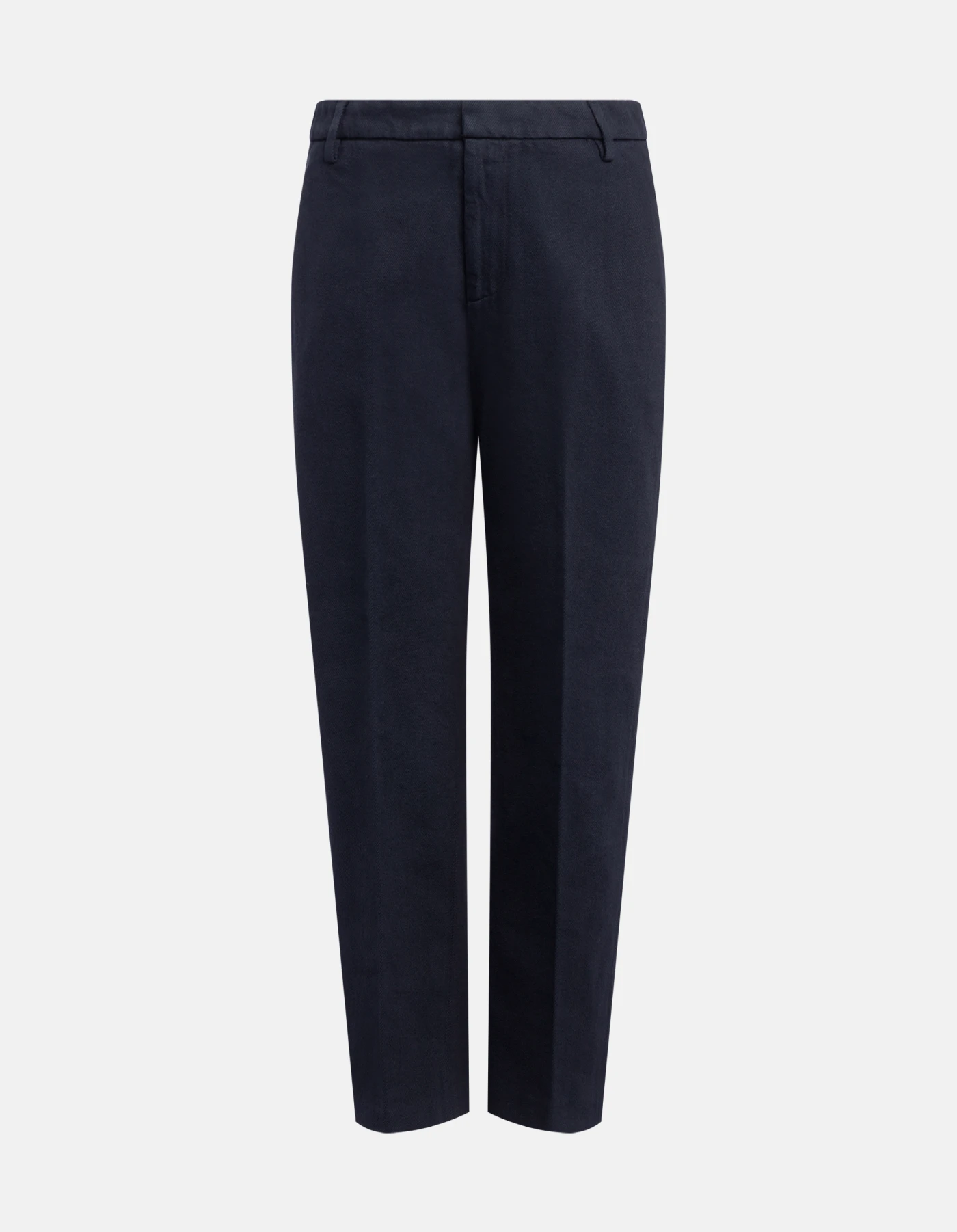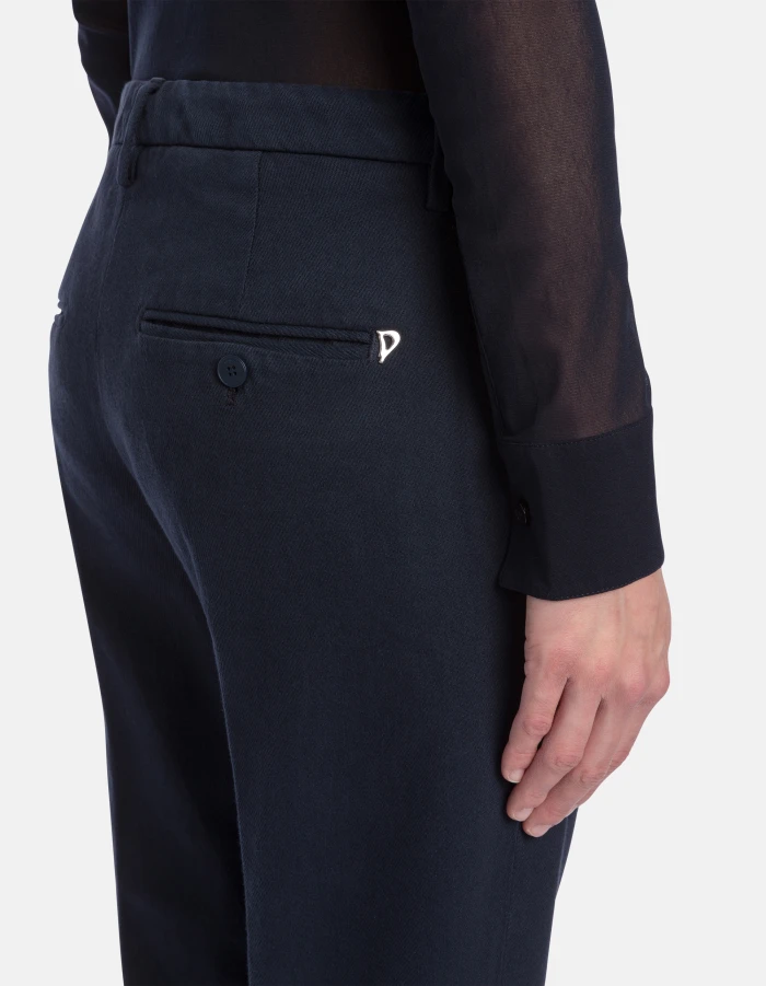 Nima loose-fit cropped chinos, regular waist, zipped flap pocket, welt pockets at the back. 10 1/4 oz bluesign APPROVED rigid bull denim. Garment-dyed. Dondup logo. Made in Italy