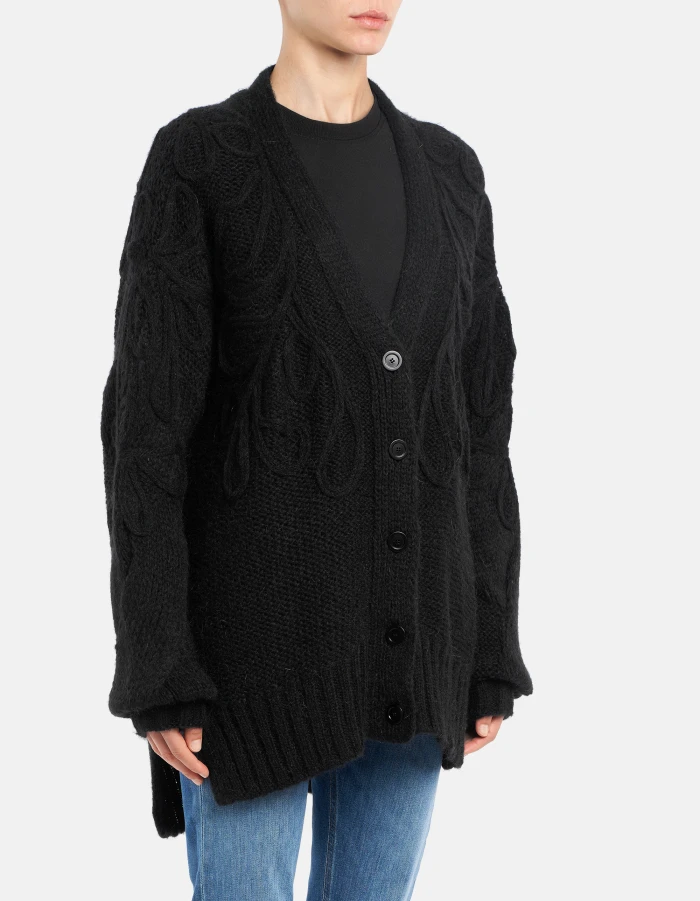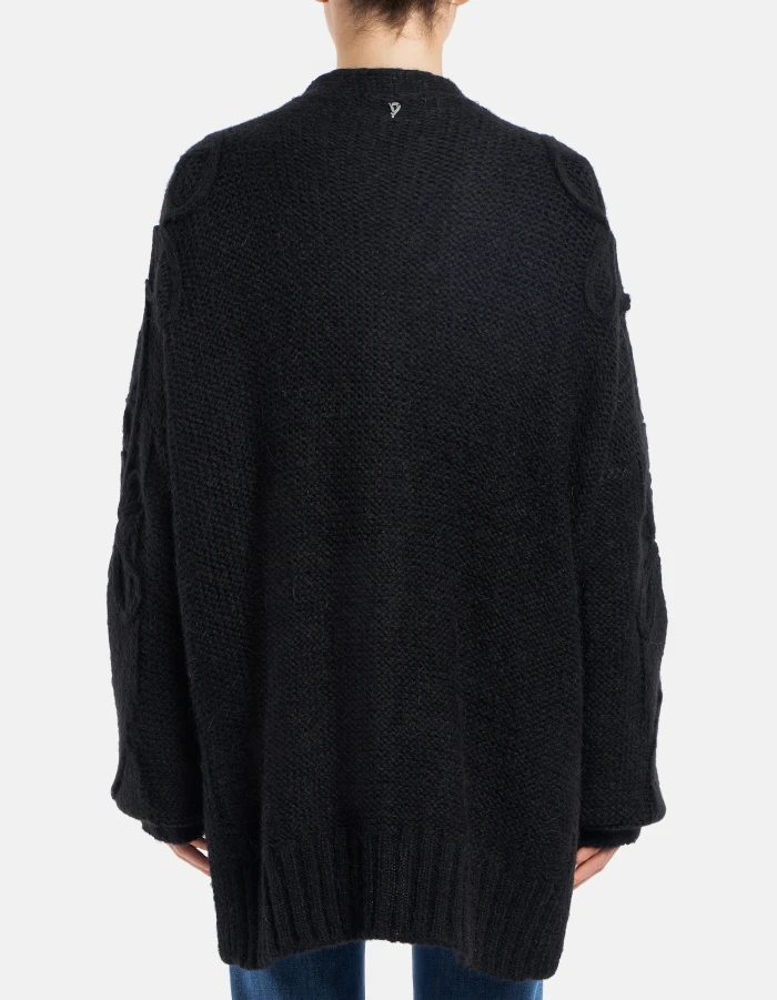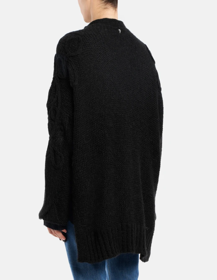 Oversized cardigan with long sleeves, cable knit on sleeve and embroidery. Logo applique at the back. Mohair wool. Dondup logo. Made in Italy