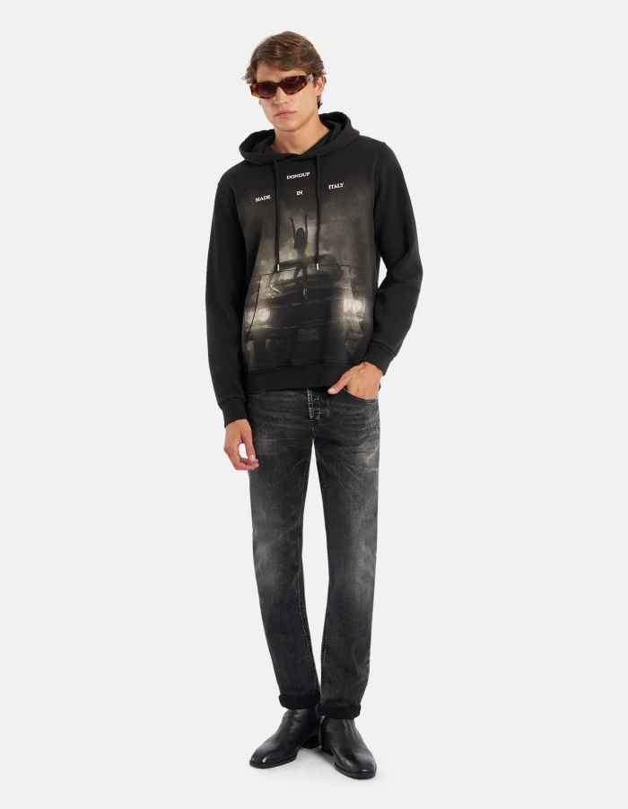 Oversized sweatshirt with hood, long sleeves, drawstring and print on the entire front. Printed fleece. Dondup logo. Made in Italy