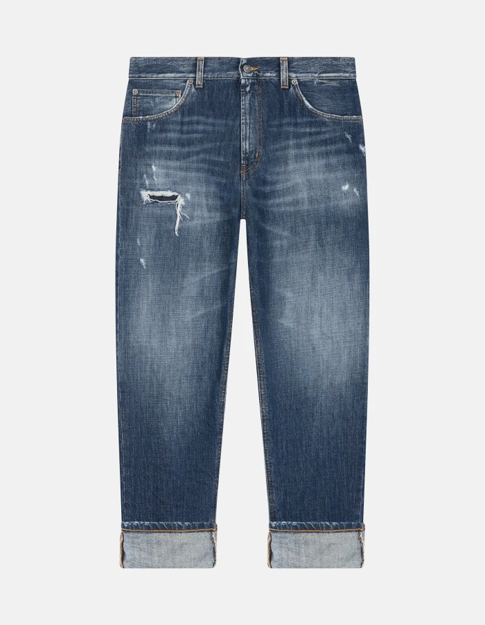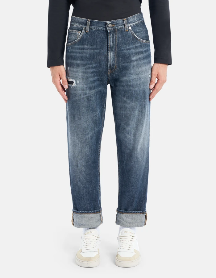 Paco loose-fit five-pocket jeans, regular waist. Blue-grey 12 3/4 oz recycled rigid denim. Dark vintage wash with rips and repairs. Dondup logo. Made in Italy