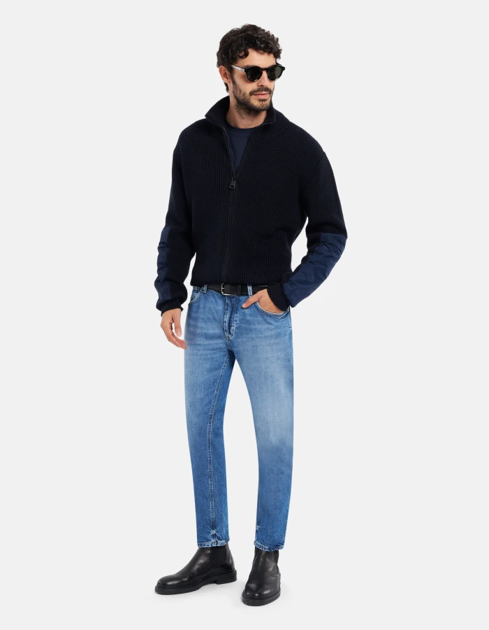 Regular-fit zipped cardigan with long sleeves, high neck and nylon insets on the sleeves. D logo appliqué on the back. Cotton and cashmere. Dondup logo. Made in Italy