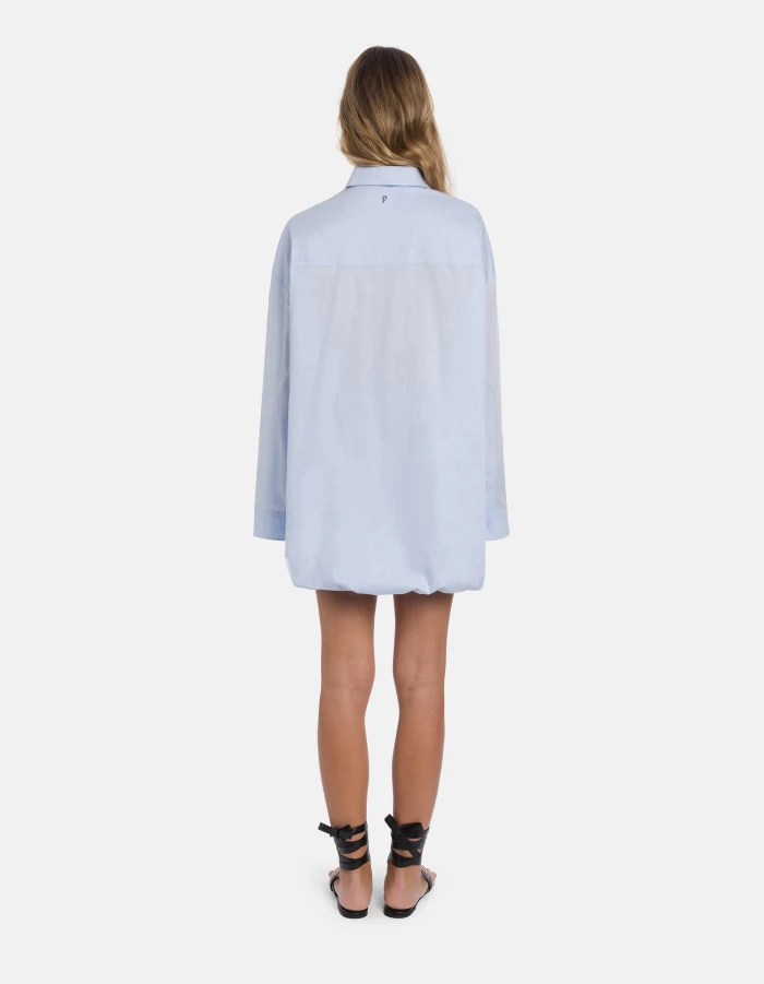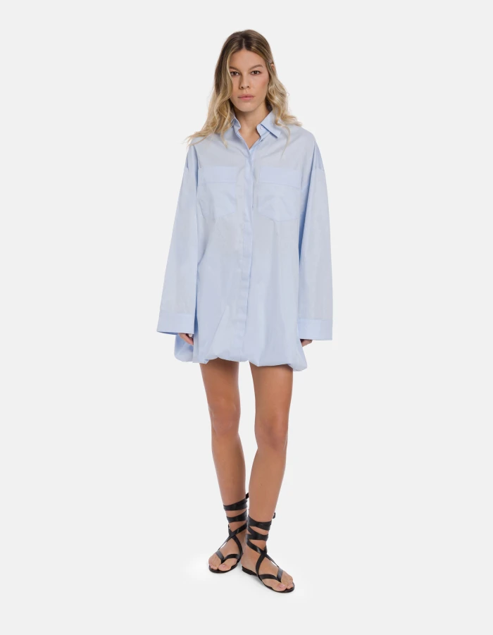Short dress with button fastening on the front and an underskirt that creates a balloon effect. Yarn-dyed gabardine. Dondup logo. Made in Italy