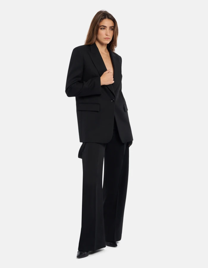 Tecla wide leg chino trousers with adjustable waistband and removable suspenders. Pure wool canvas. Dondup logo. Made in Italy