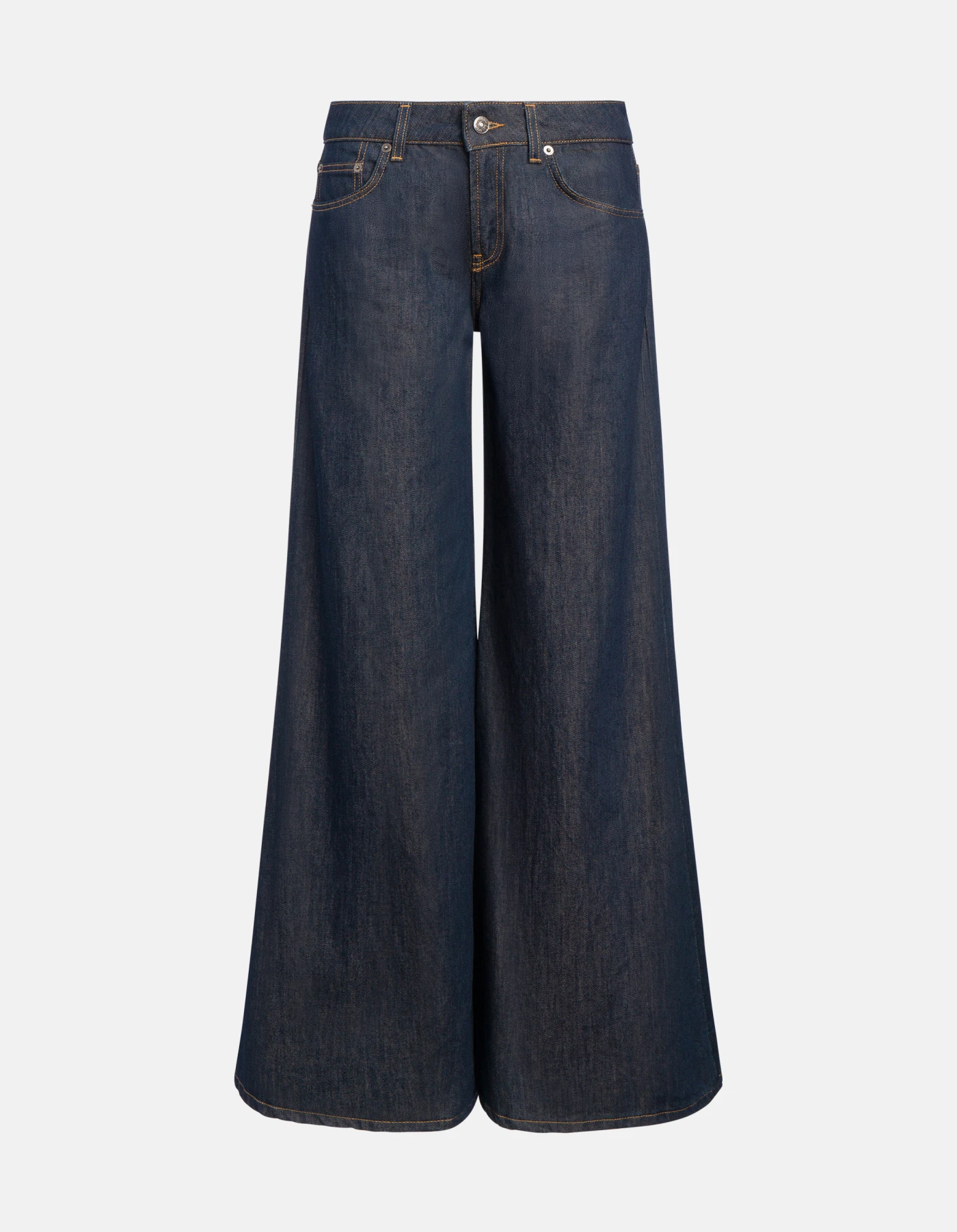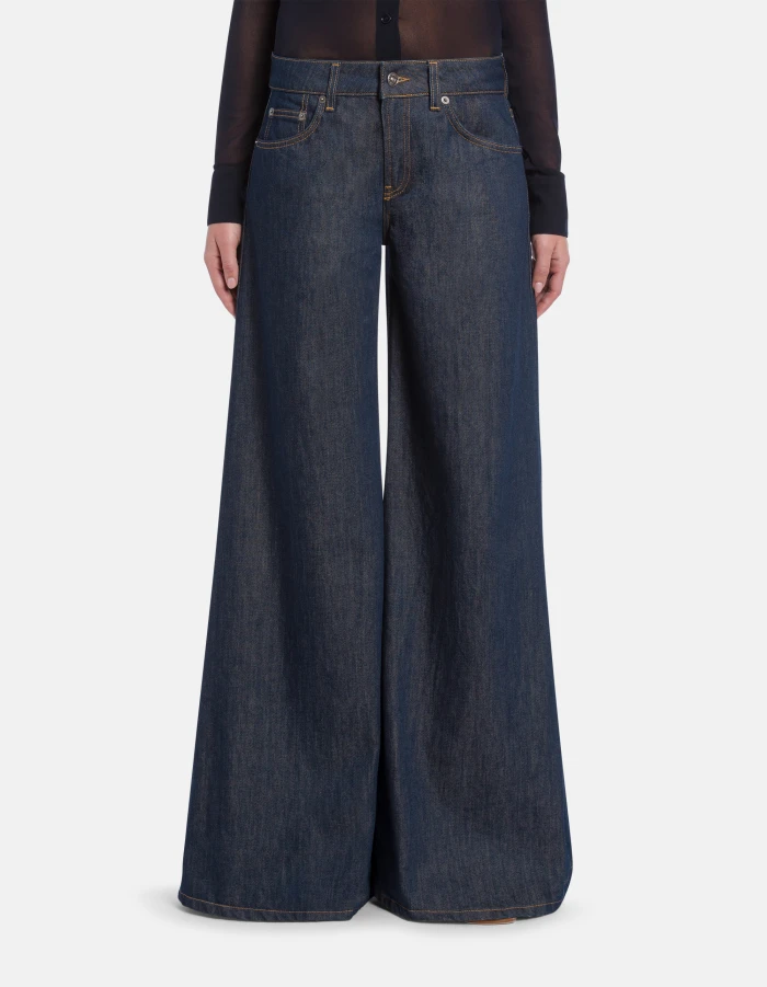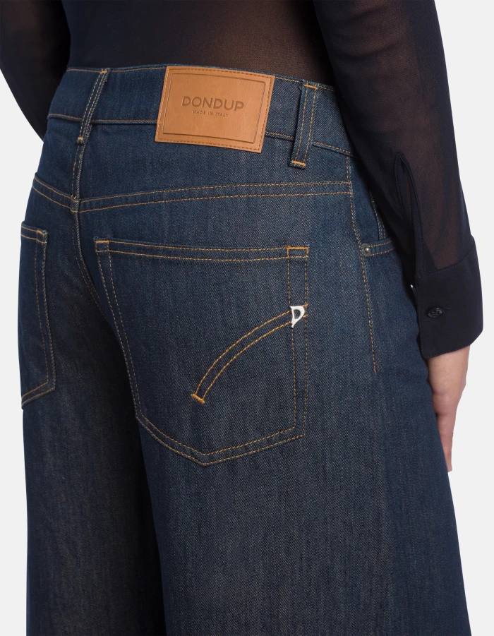 Marlen very wide leg 5-pocket jeans, regular waist. 11.5 oz colourful weave rigid denim. Clean dark wash. Dondup logo. Made in Italy