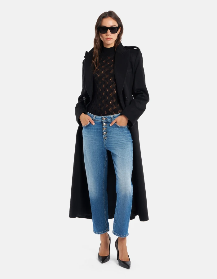 Koons loose-fit five-pocket jeans, regular waist, jewel button panel, ankle length. Blue 10 oz left-hand stretch denim. Light clean wash. Dondup logo. Made in Italy
