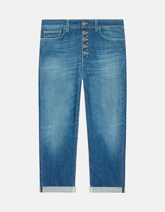 Koons loose-fit five-pocket jeans, regular waist, jewel button panel, ankle length. Flame Green 11 oz comfort stretch blue denim. Clean medium dark greencast wash. Dondup logo. Made in Italy