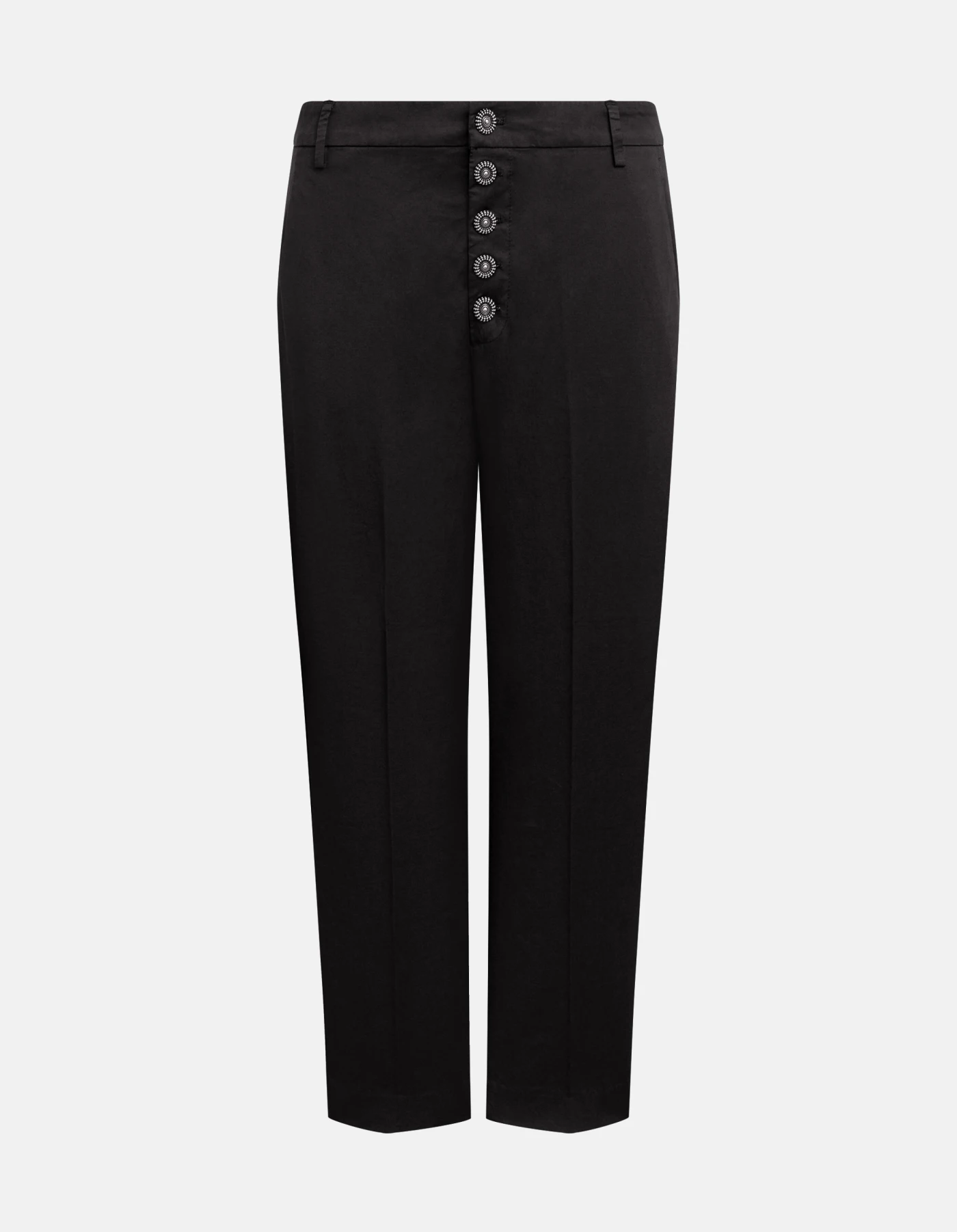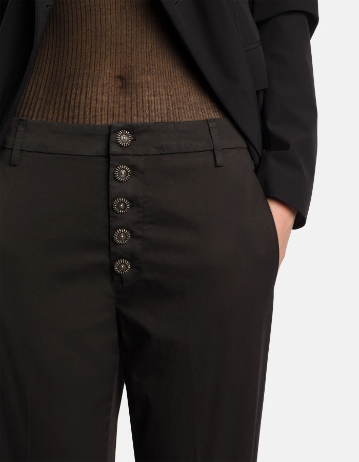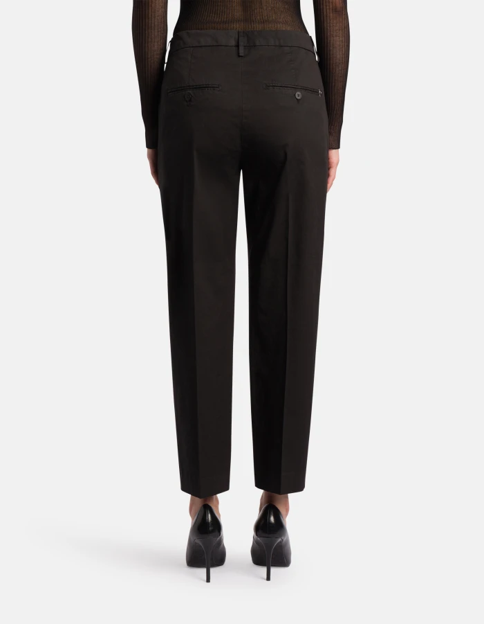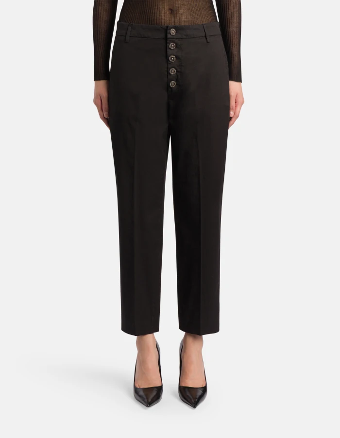 Nima loose-fit cropped chinos, regular waist, jewel button panel, welt pockets at the back. Lightweight gabardine. Garment dyed. Dondup logo. Made in Italy