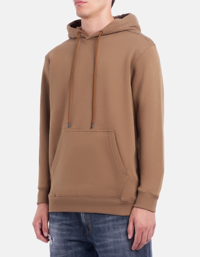 Regular-fit sweatshirt with hood, long sleeves, kangaroo pocket and logo print on the left shoulder. Cotton fleece. Dondup logo. Made in Italy