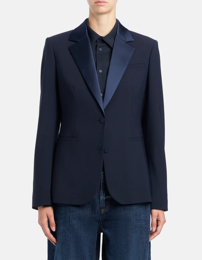 Slim-fit single-breasted blazer with two buttons, satin lapels and welt pockets. Bi-stretch weave. Dondup logo. Made in Italy