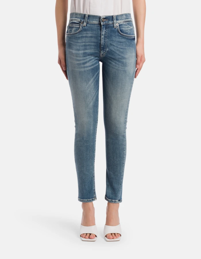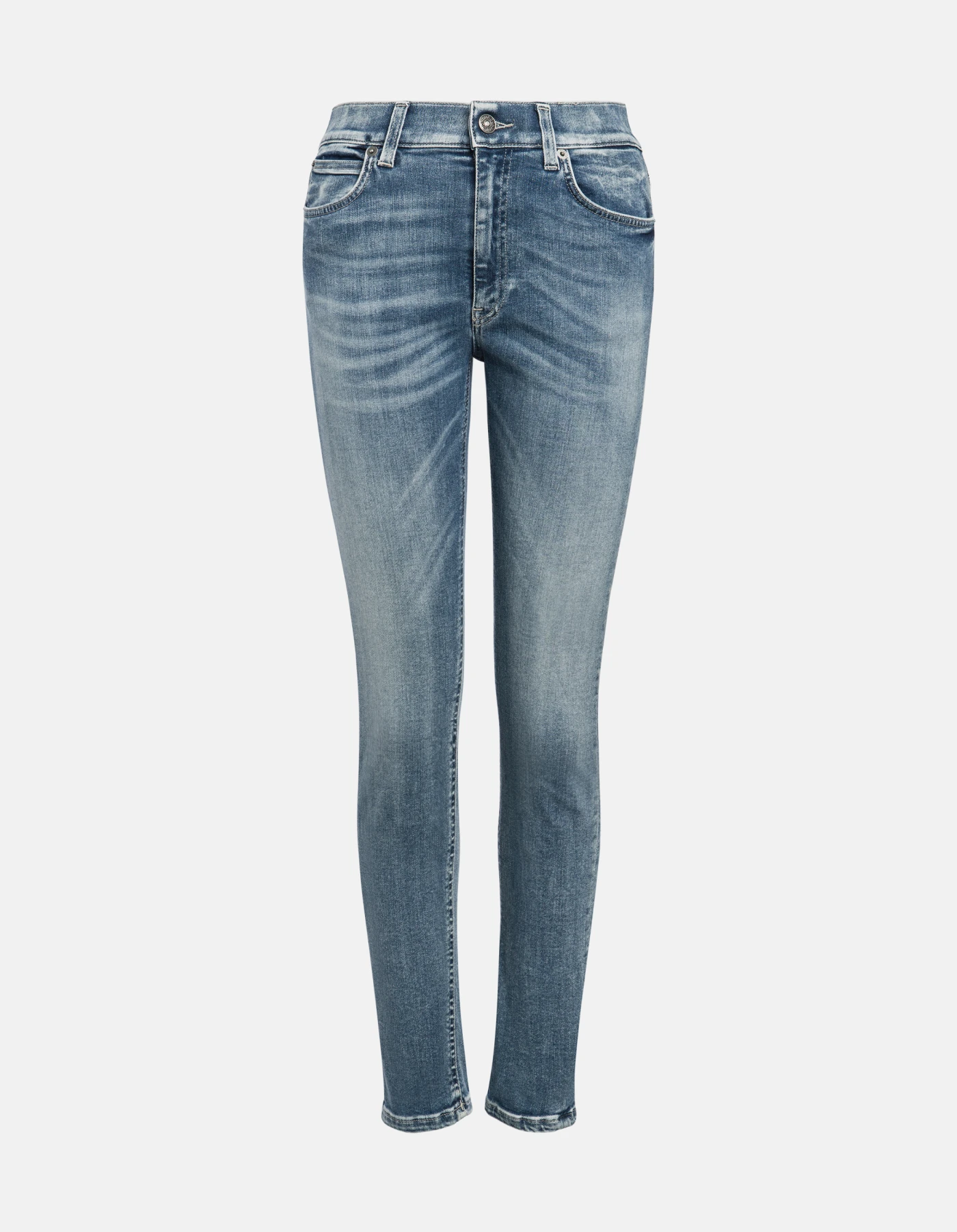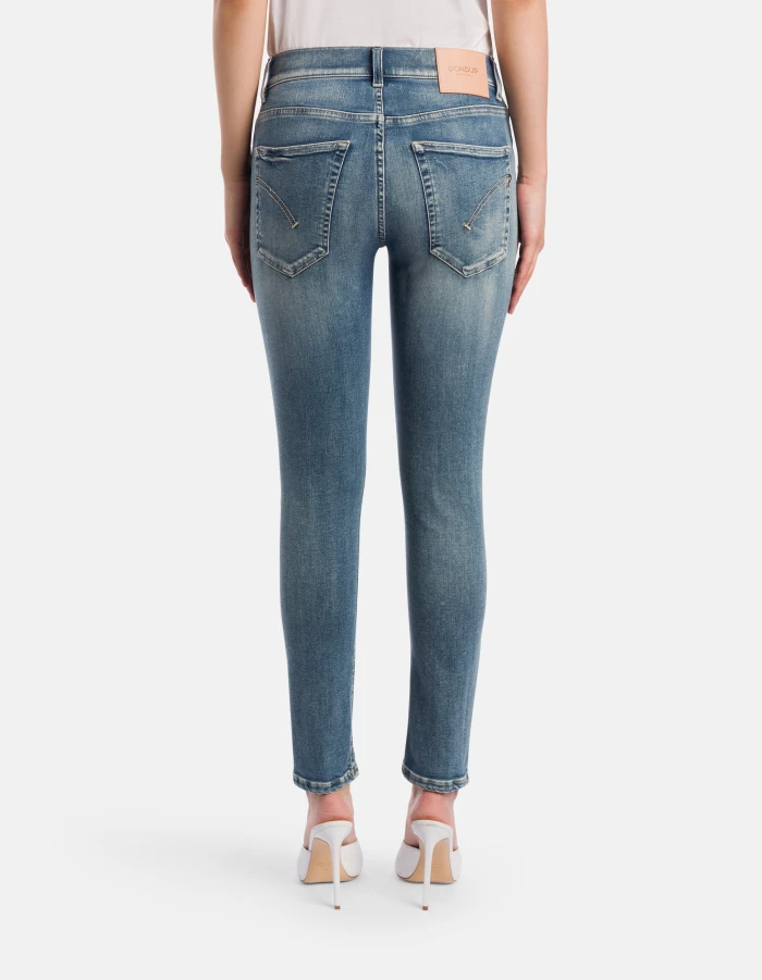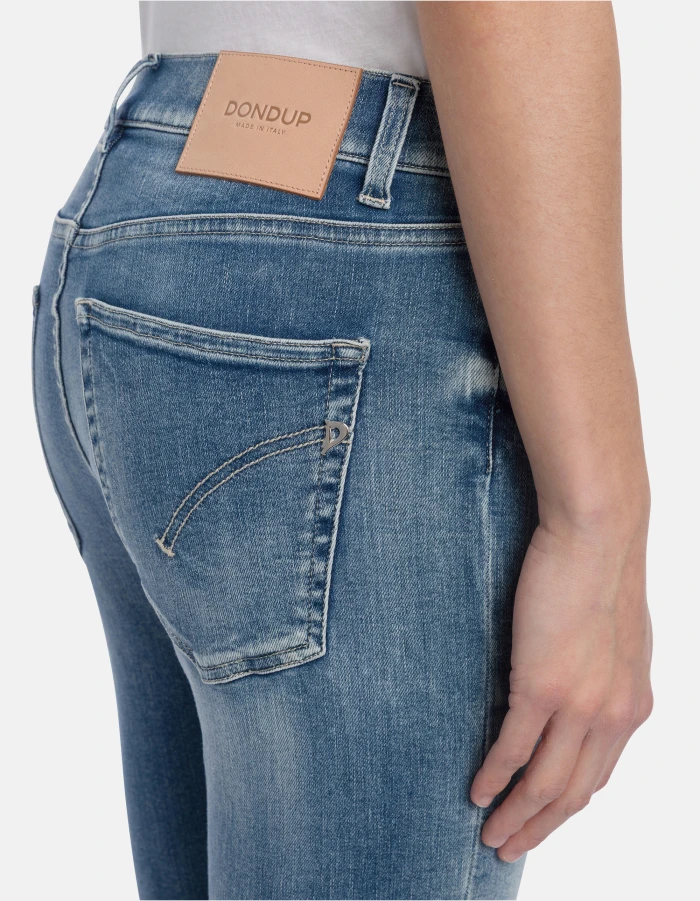Kim super-skinny 5-pocket jeans, high rise. Blue 11 oz high-stretch denim. Clean medium light vintage wash. Dondup logo. Made in Italy