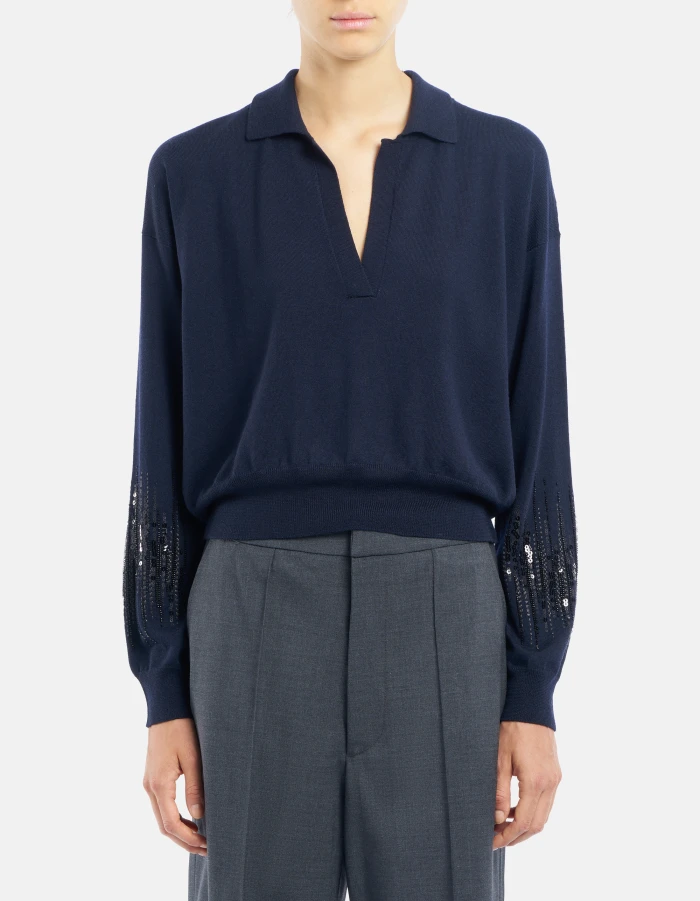 Regular-fit polo shirt with long sleeves, Fisherman’s rib hem and cuffs and rhinestones on sleeves. Logo applique at the back. Wool. Dondup logo. Made in Italy