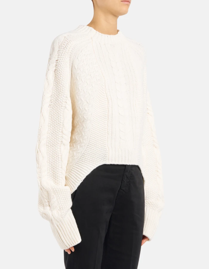 Oversized crew-neck jumper with long sleeves and shorter at the front. Logo applique at the back. Varied knit patterns. Dondup logo. Made in Italy