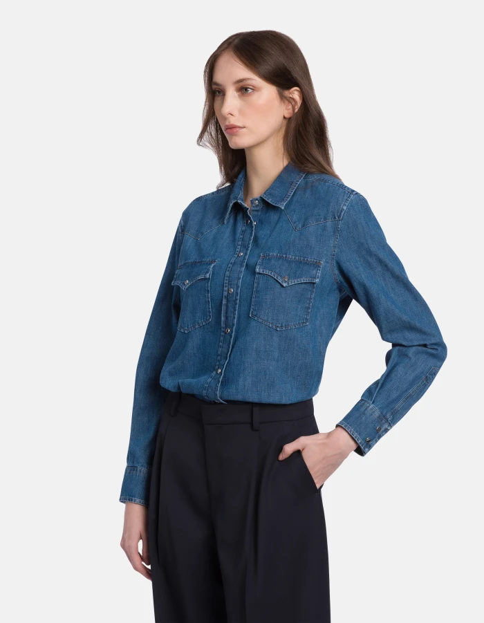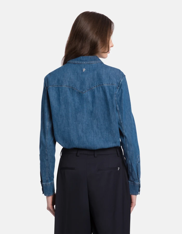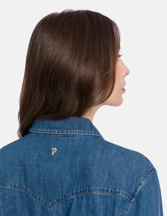 Regular-fit Western-style shirt with long sleeves, patch pockets on chest and contrasting stitching. Blue 7 oz rigid denim. Clean medium wash. Dondup logo. Made in Italy