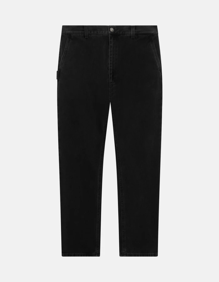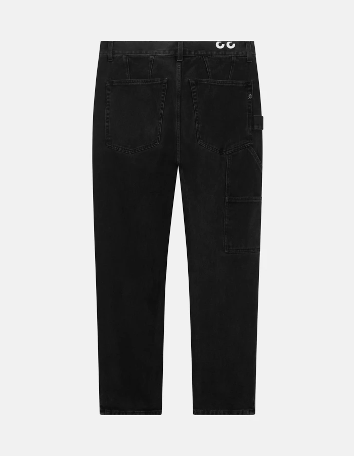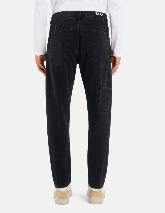 Five-Pocket-Jeans Brian im Worker-Stil mit niedrigem Bund und schrägen Eingrifftaschen. Carrot-Passform. Nachhaltiger Rigid Denim in Black/Black, 12 3/4 oz. Schlichte schwarze Waschung. Dondup-Logo. Made in Italy