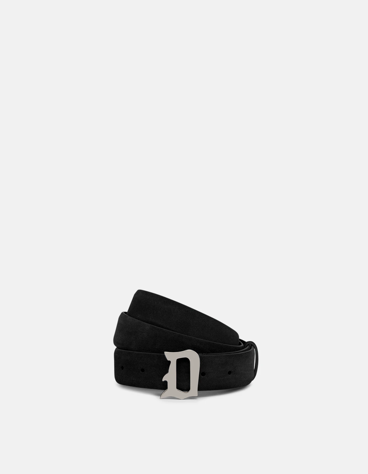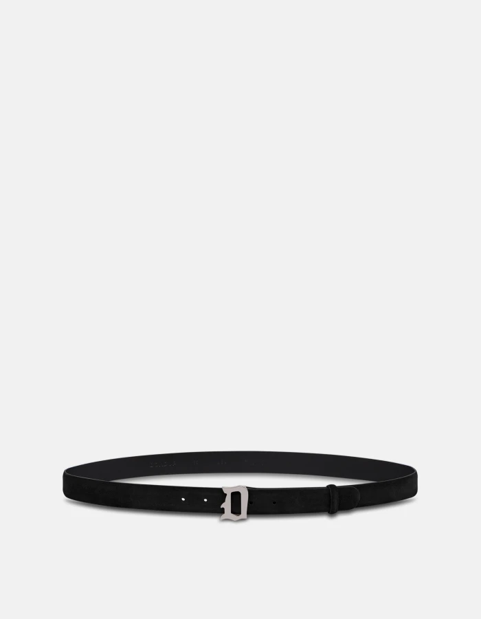 3 cm breiter Gürtel mit D-Schnalle im Gothic-Stil mit satiniertem Nickel-Finish. Spaltleder. Dondup-Logo. Made in Italy