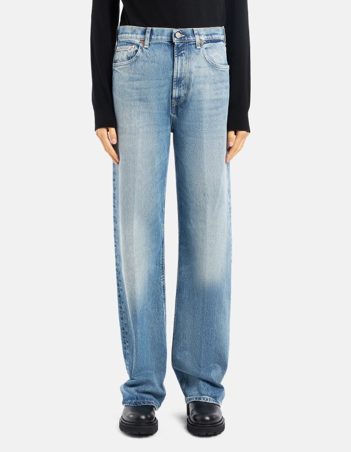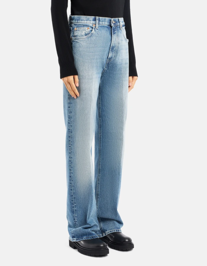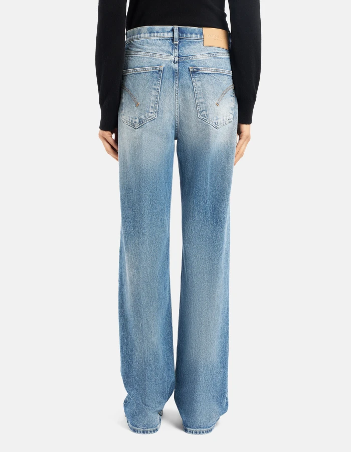 Five-Pocket-Jeans Francine in Wide Leg-Passform mit niedrigem Bund. Blauer recycelter Comfort-Denim mit Stretchanteil, 12 1/2 oz. Schlichte helle Vintage-Waschung. Dondup-Logo. Made in Italy