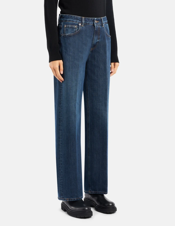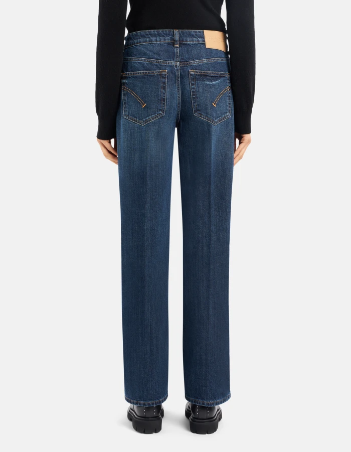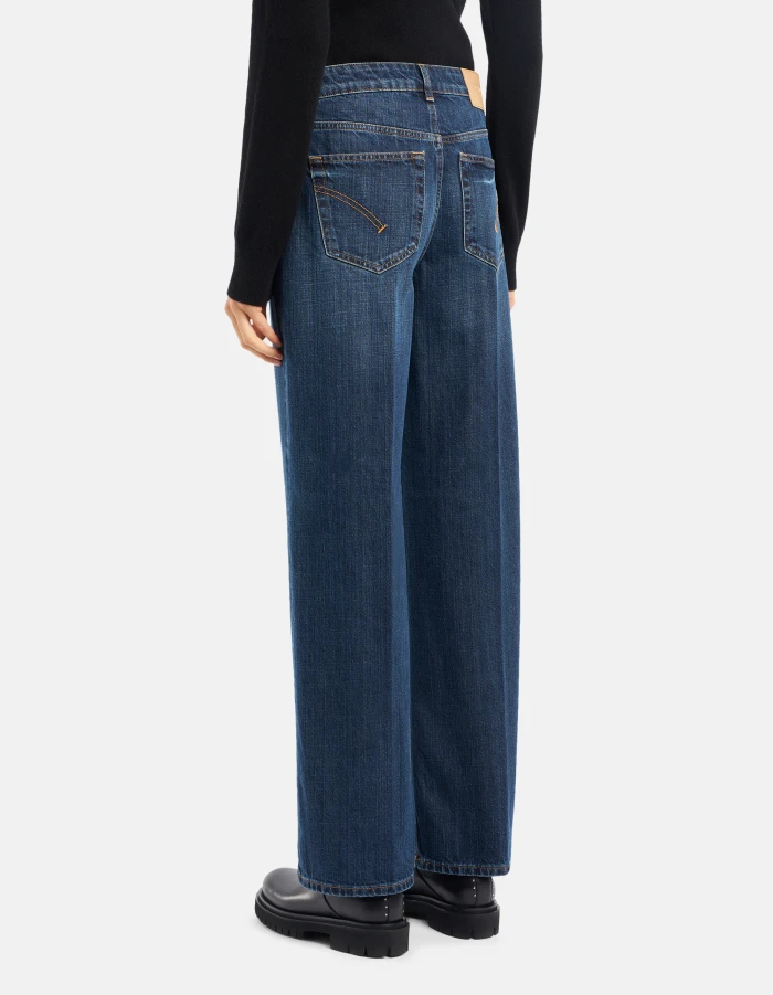 Five-Pocket-Jeans Karis in Wide Leg-Passform mit normalem Bund und geradem Bein. Blauer Rigid Cross-Denim, 12 1/2 oz. Schlichte dunkle Waschung. Dondup-Logo. Made in Italy