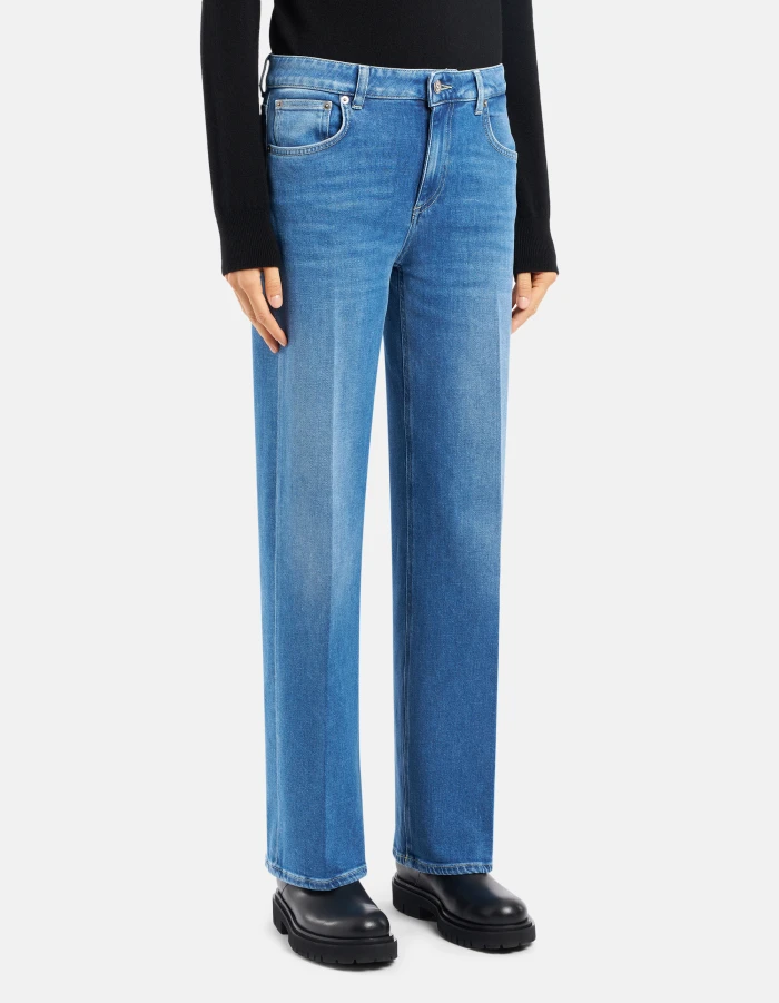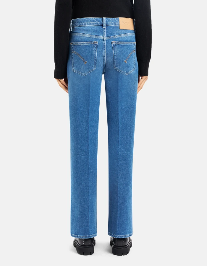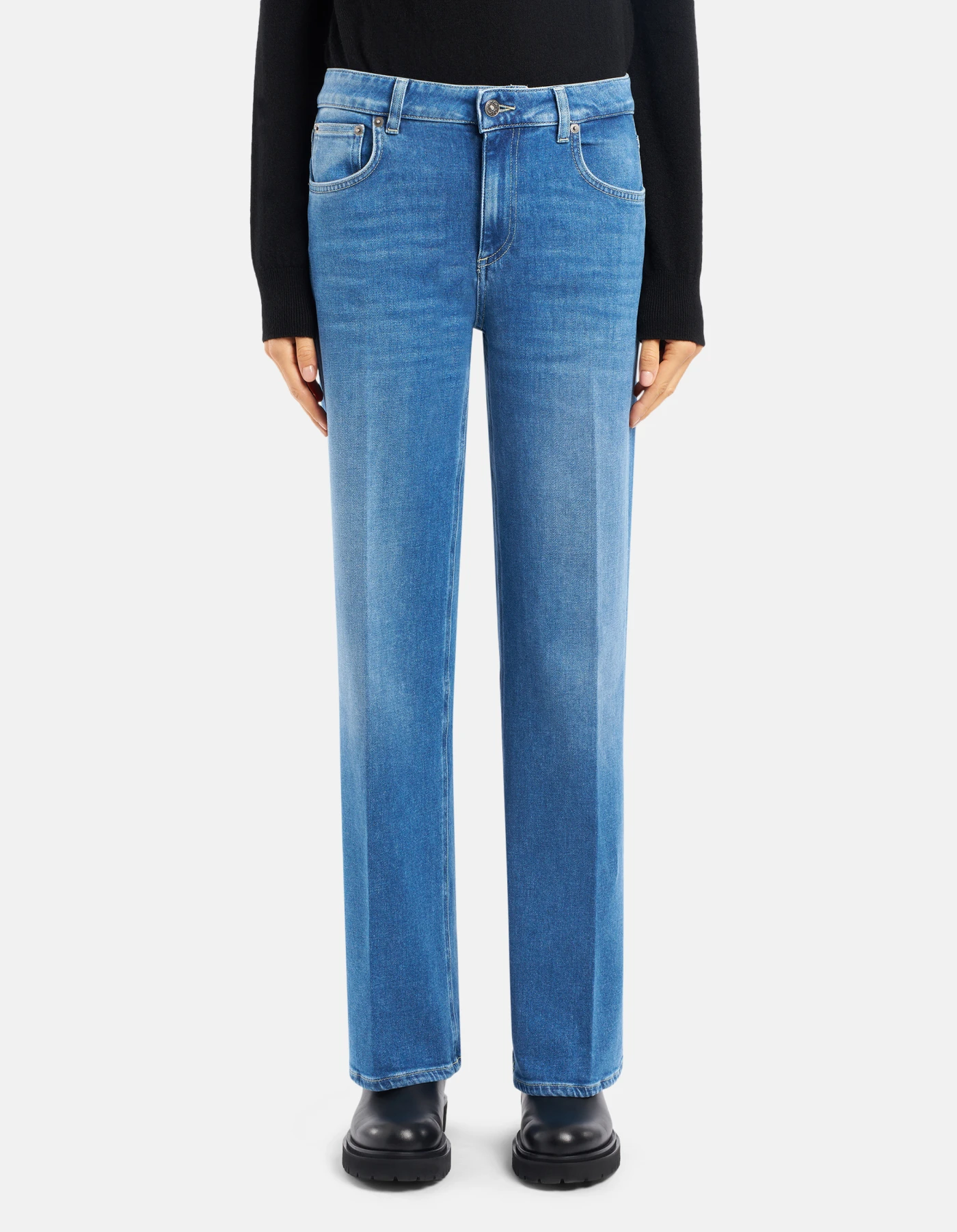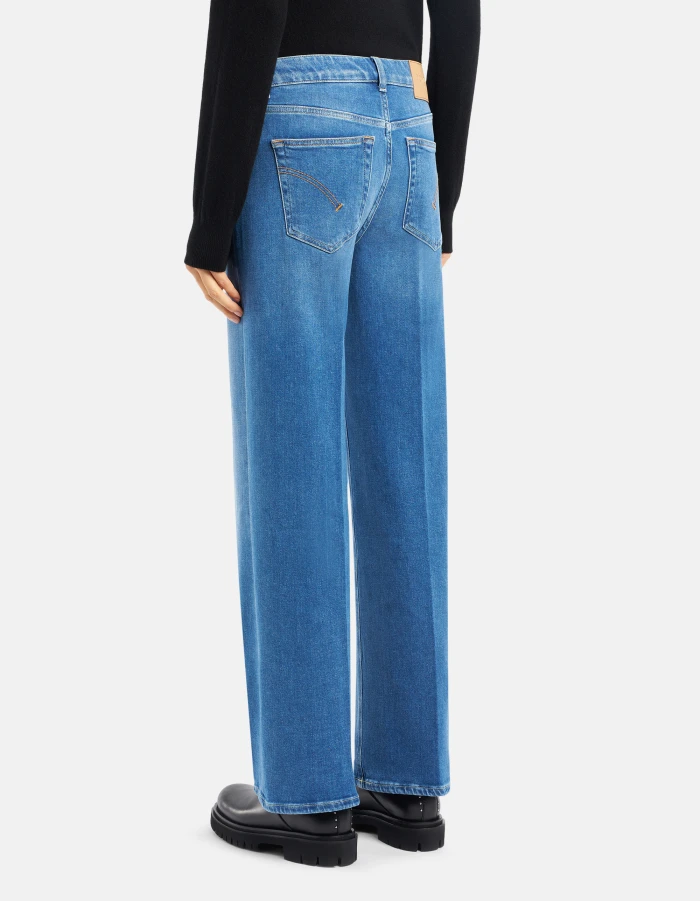 Five-Pocket-Jeans Karis in Wide Leg-Passform mit normalem Bund und geradem Bein. Blauer Stretch-Comfort-Denim, 12 1/4 oz. Schlichte mittelhelle Waschung. Dondup-Logo. Made in Italy