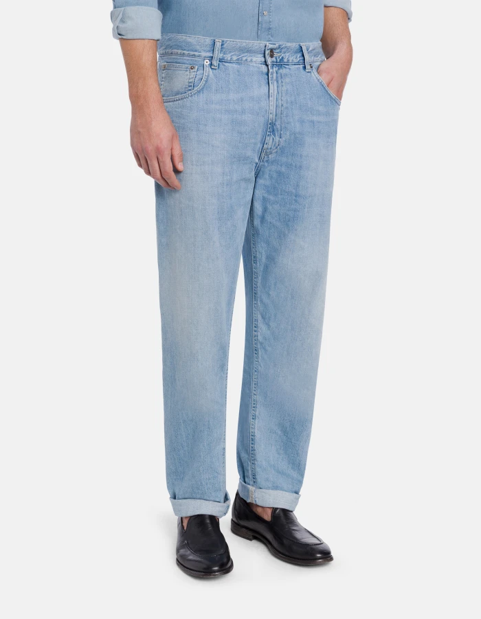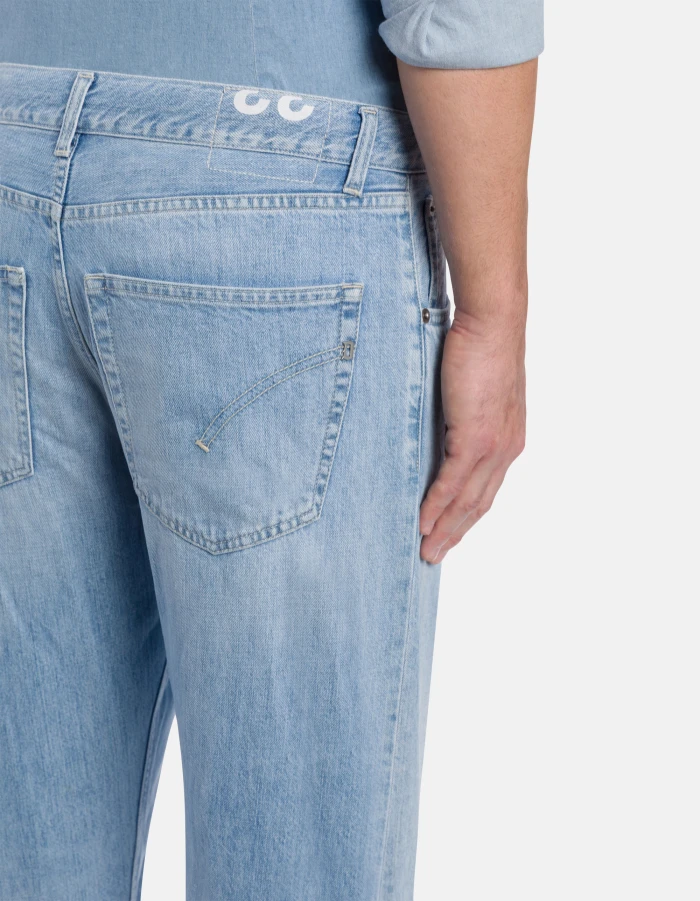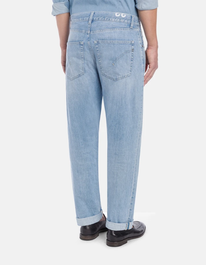Five-Pocket-Jeans Ervin in legerer Passform mit niedrigem Bund. Blauer Rigid Cross-Denim, 12,50 oz. Schlichte helle Waschung. Dondup-Logo. Made in Italy