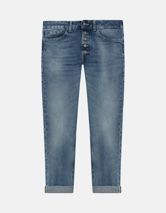 Knöchellange Five-Pocket-Jeans Koons in legerer Passform mit normalem Bund und Zierknopfleiste. Blauer recycelter Stretch-Comfort-Denim, 12 1/2 oz. Schlichte helle Vintage-Waschung. Dondup-Logo. Made in Italy