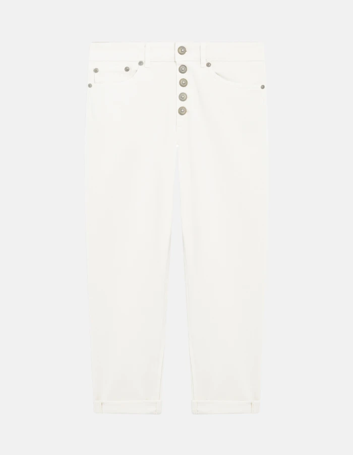 Knöchellange Five-Pocket-Jeans Koons in legerer Passform mit normalem Bund und Zierknopfleiste. Stretch-Bull Bluesign APPROVED, 11 1/2 oz. Bluesign-Stückfärbung. Dondup-Logo. Made in Italy