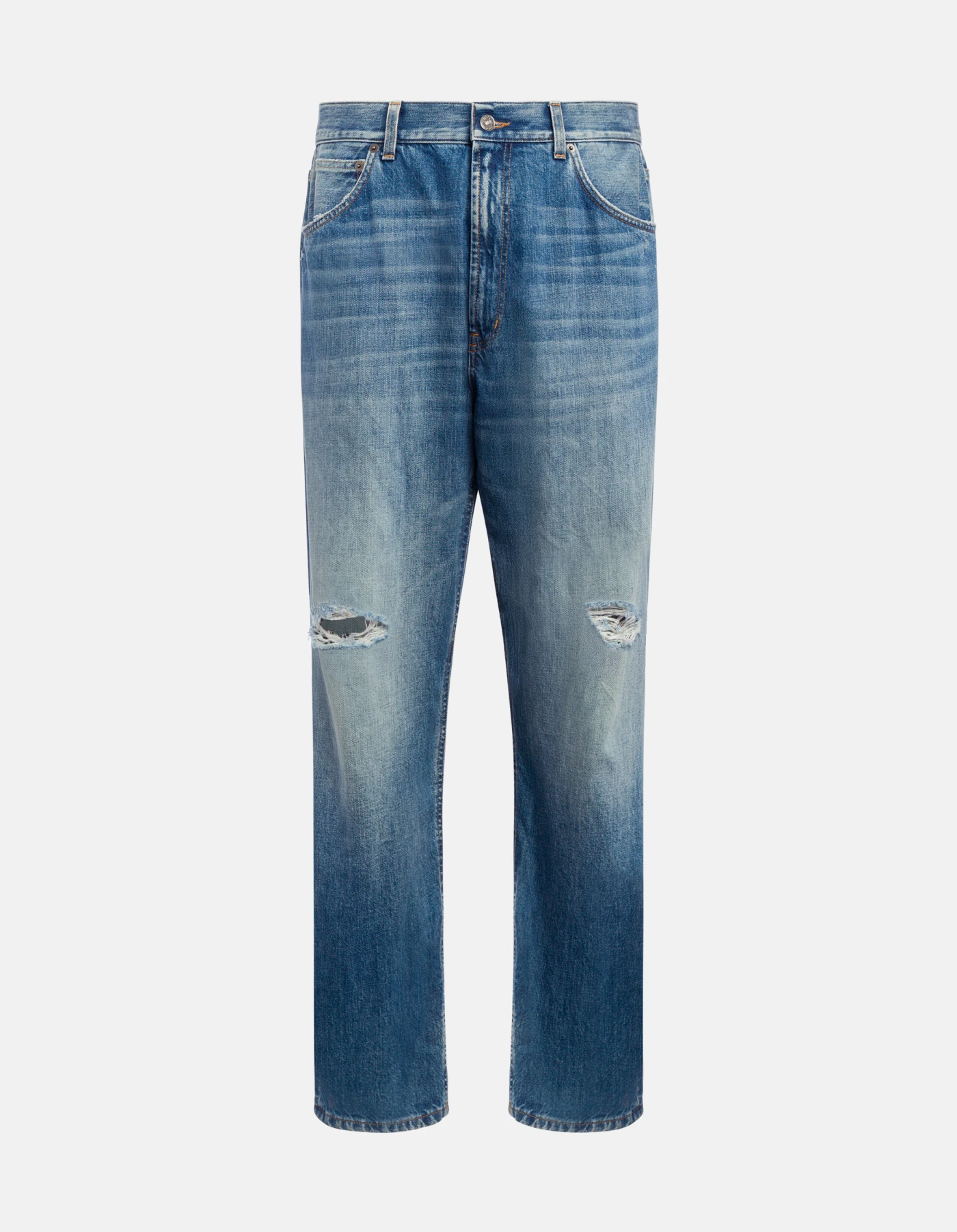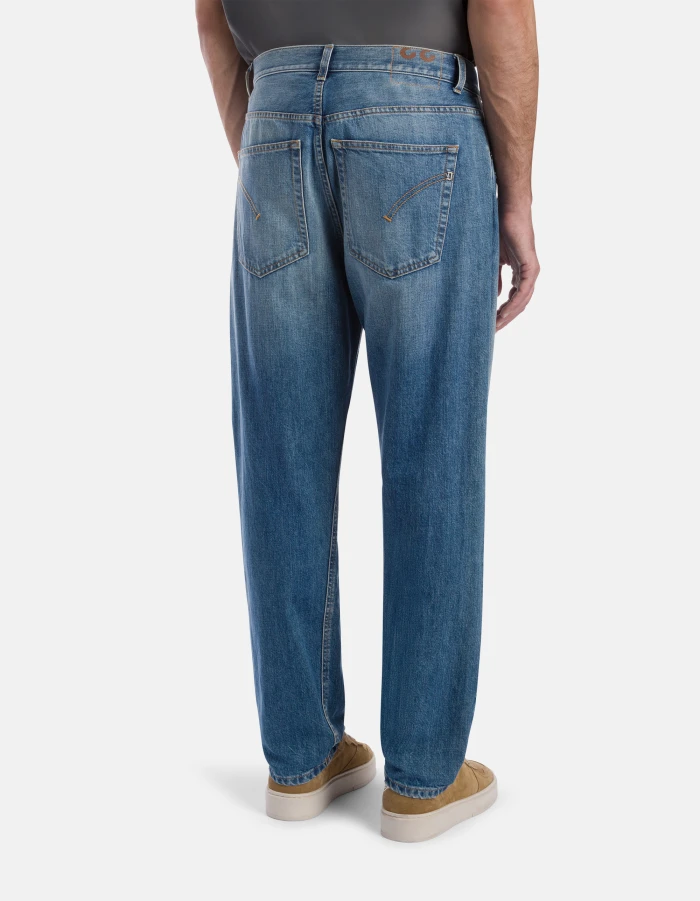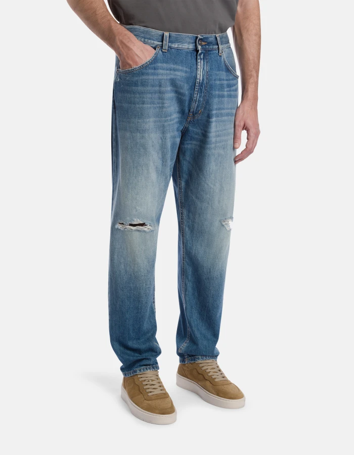 Five-Pocket-Jeans Paco in lockerer Passform mit normalem Bund. Blauer Rigid Cross-Denim, 12,50 oz. Mittelhelle Waschung mit Rissen. Dondup-Logo. Made in Italy