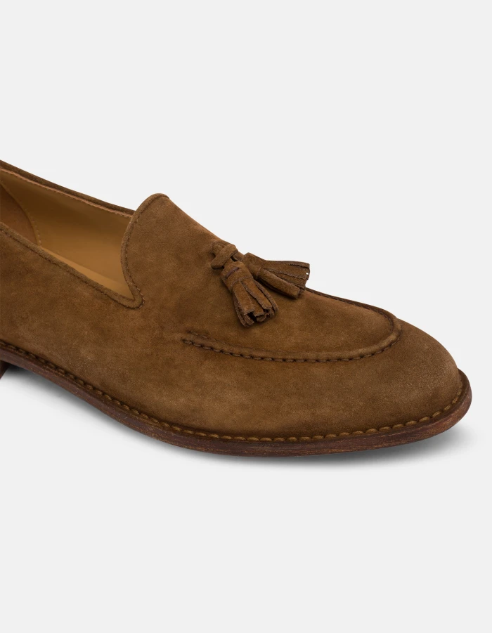 Mokassins mit Quasten und Ledersohle. Vintage-Behandlung. Wildleder. Made in Italy
