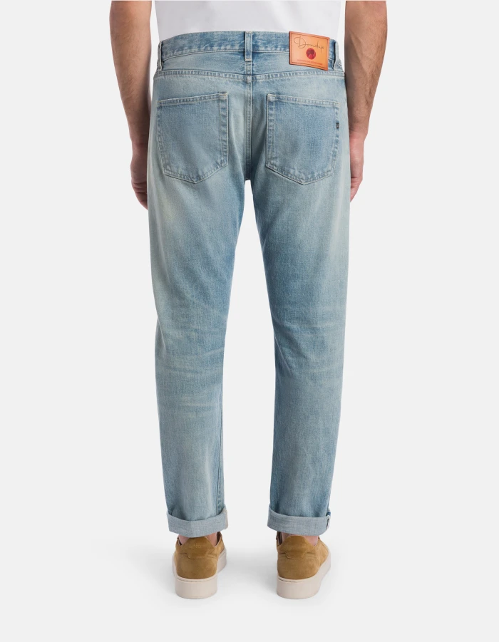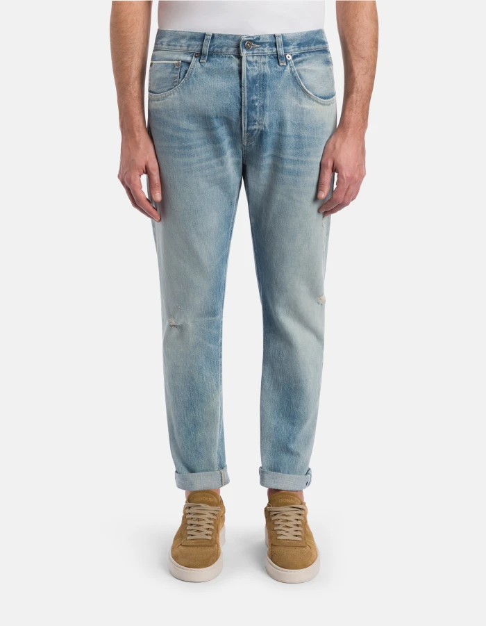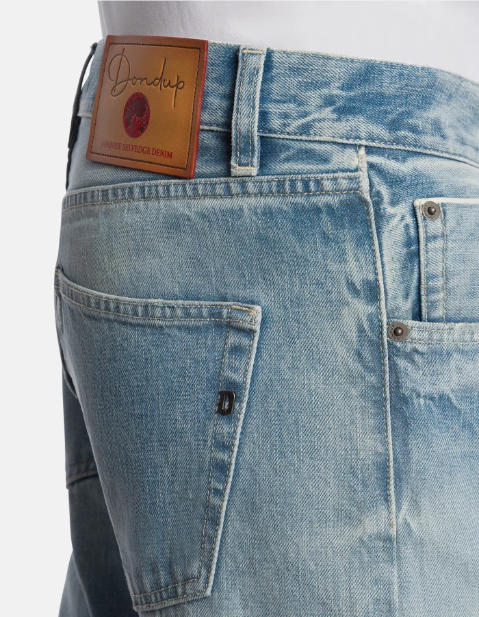Five-Pocket-Jeans Icon in normaler Passform mit normalem Bund. Blauer Rigid Denim mit Webkante, 14 oz. Helle Vintage-Waschung mit Rissen. Dondup-Logo. Made in Italy