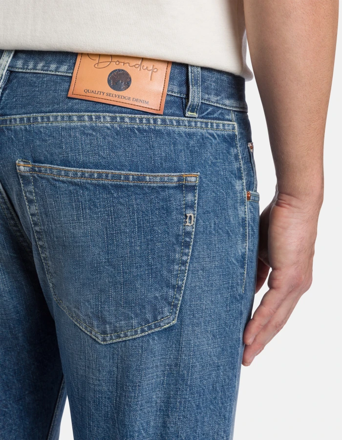 Five-Pocket-Jeans Icon in normaler Passform mit normalem Bund. Blauer Rigid Denim mit Webkante, 14 oz. Schlichte mitteldunkle Waschung. Dondup-Logo. Made in Italy