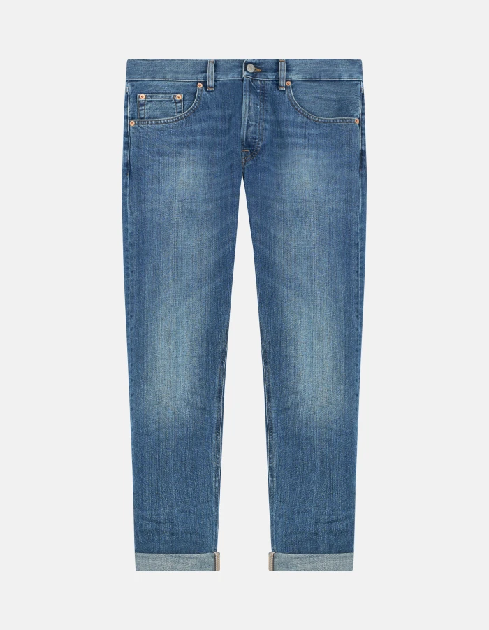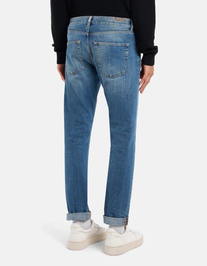 Five-Pocket-Jeans Icon in normaler Passform mit normalem Bund. Blauer Rigid Cross-Denim, 12 1/2 oz. Schlichte mittlere Waschung. Dondup-Logo. Made in Italy