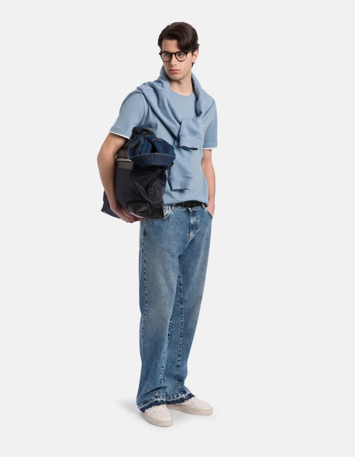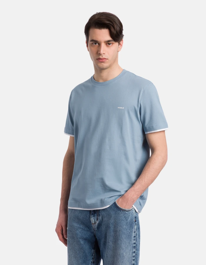 Kurzärmliges Rundhals-T-Shirt in normaler Passform mit Kragen, Ärmeln und Saum in Kontrastoptik und Logo-Print links an der Brust. Zweifarbiges Piqué. Dondup-Logo. Made in Italy