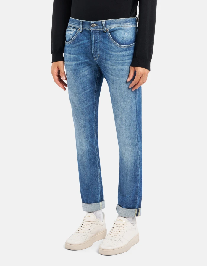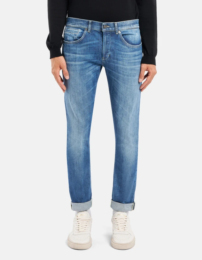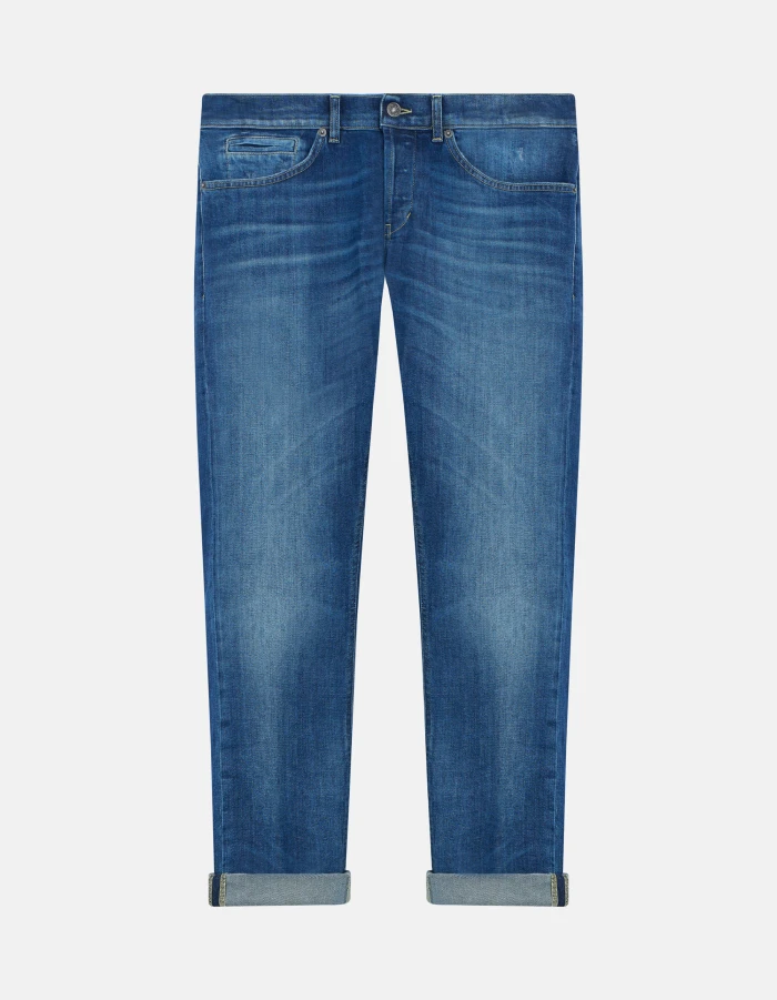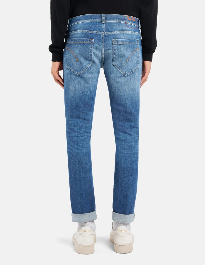 Five-Pocket-Jeans George in Skinny-Passform mit niedrigem Bund und kleiner Leistentasche. Blauer nachhaltiger Stretch-Denim, 11 1/2 oz. Mittelhelle GOTS-Waschung mit kleinen Rissen. Dondup-Logo. Made in Italy