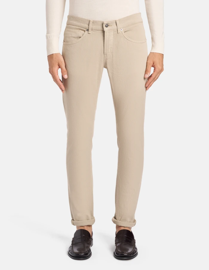 Five-Pocket-Jeans George in Skinny-Passform mit niedrigem Bund und kleiner Leistentasche. Stretch-Bull Bluesign APPROVED, 11 1/2 oz. Bluesign-Stückfärbung. Dondup-Logo. Made in Italy