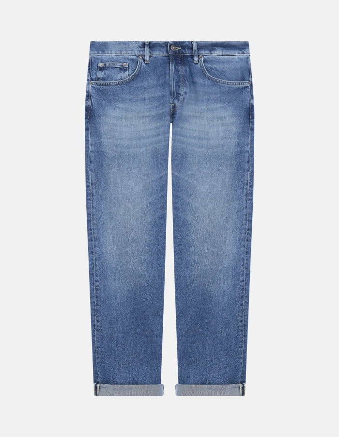 Icon regular-fit five-pocket jeans, regular waist. Blue 14 oz stretch denim. Light clean wash. Dondup logo. Made in Italy