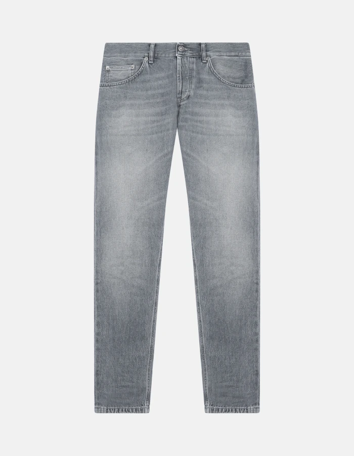 Mius slim-fit 30-inch five-pocket jeans, low waist. Grey 10.50 oz rigid denim. Light grey vintage wash with rips. Dondup logo. Made in Italy