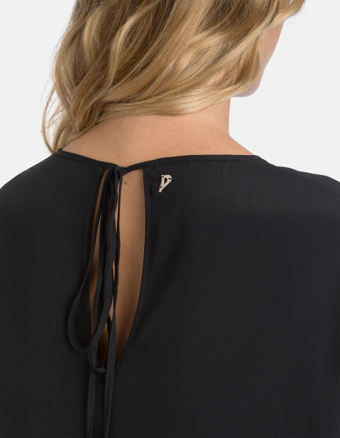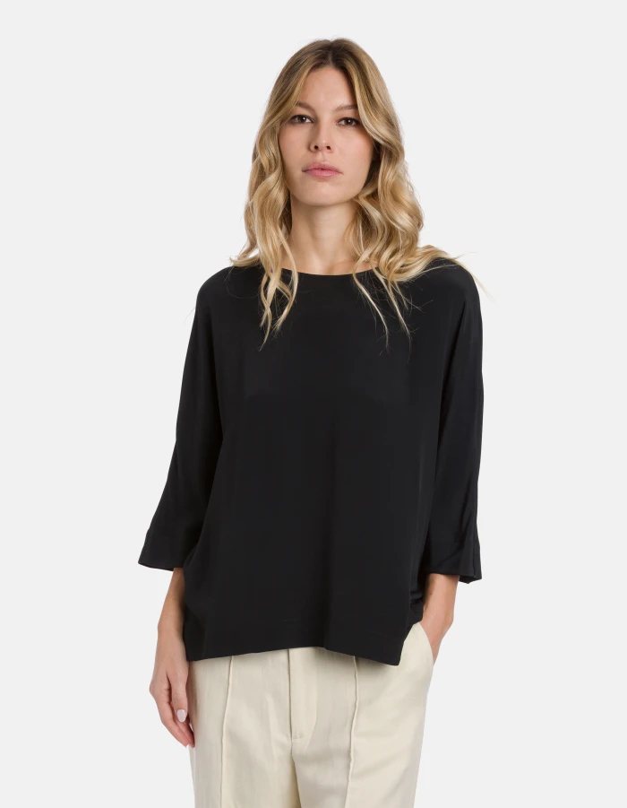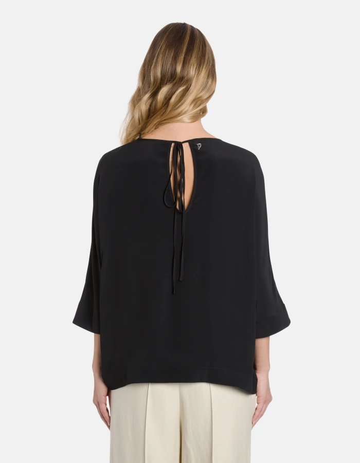 Three-quarter sleeve shirt with teardrop opening at the back and drawstring fastening. Silk-blend crepe de chine. Dondup logo. Made in Italy