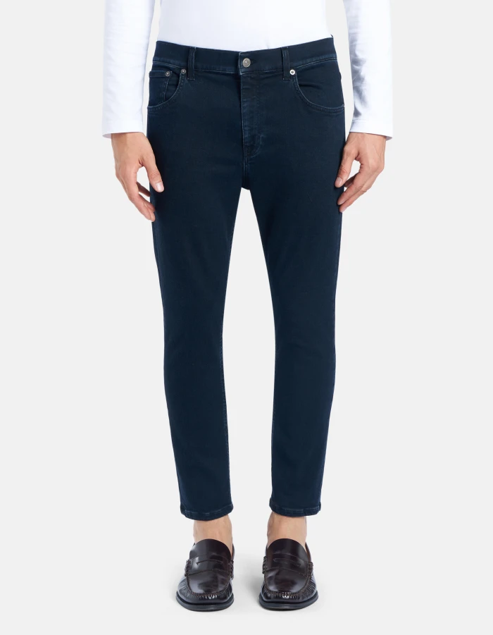 Alex super-skinny five-pocket jeans, regular waist, dropped crotch.  Blue/black 11 oz power stretch denim.  Clean blue/black wash. Dondup logo. Made in Italy