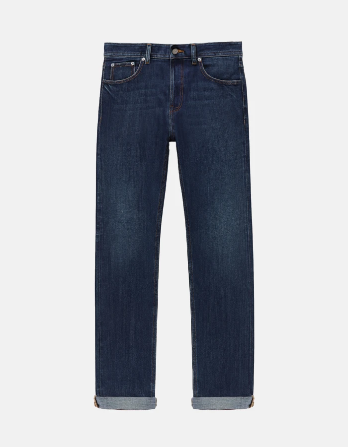Icon regular-fit five-pocket jeans, regular waist. Blue 12 1/2 oz rigid cross denim. Clean dark wash. Dondup logo. Made in Italy