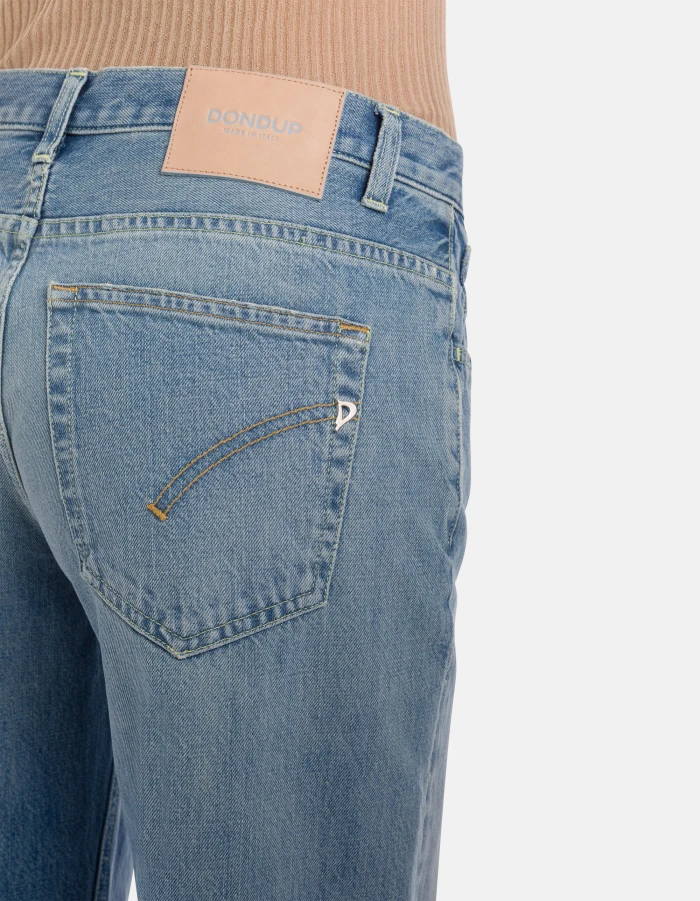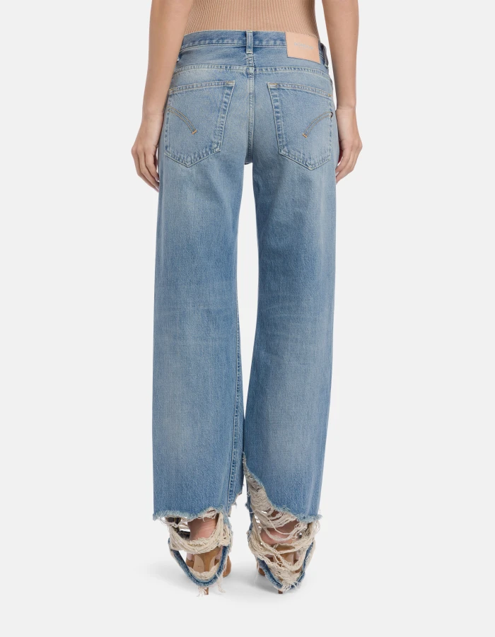 Jacklyn wide-leg 5-pocket palazzo jeans, low rise. Blue 13 oz salt & pepper rigid denim. Light vintage wash with frayed hem. Dondup logo. Made in Italy